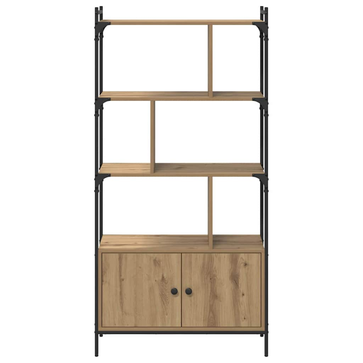 This wooden bookcase offers a perfect solution for organizing and displaying your books and decor. With its modern, minimalist design, it can seamlessly blend into various settings, adding both functionality and aesthetic value to your living space. Crafted from engineered wood, the bookcase is designed to provide ample storage through its irregularly arranged dividers, catering to diverse storage needs and creative arrangement. Its sleek appearance and sturdy build make it not only a practical storage solution but a stylish addition to any room. Engineered Wood Composition The bookcase is constructed from high-quality engineered wood, known for its abrasion resistance, ensuring longevity and durability. This material choice minimizes wear and tear, allowing the bookcase to maintain its appearance even with continuous daily use. The engineered wood provides a smooth and refined look, complementing the modern aesthetic of your home decor. Metal Square Legs Equipped with modern and sturdy black metal square legs, this bookcase offers enhanced stability and support, allowing it to securely hold books and decorative items. The minimalistic leg design fits well with contemporary or minimalist interiors, ensuring the bookcase remains a prominent piece in any space. Hinge Doors with Handles The bookcase features hinge doors crafted from engineered wood, with matte black knobs providing an elegant and functional opening mechanism. These components are designed to offer easy access to items stored inside while maintaining a sleek appearance. Ample Storage Capacity Designed with multiple open shelves, this bookcase offers plenty of space to keep your books organized and accessible. Its irregularly arranged dividers add a unique visual element, allowing you to creatively display items of various sizes. Secure Usage Guidance Safety is prioritized with the inclusion of a wall attachment device, ensuring the bookcase remains stable. Note that screws and plugs specific to your wall type are not included but recommended for maximum security.