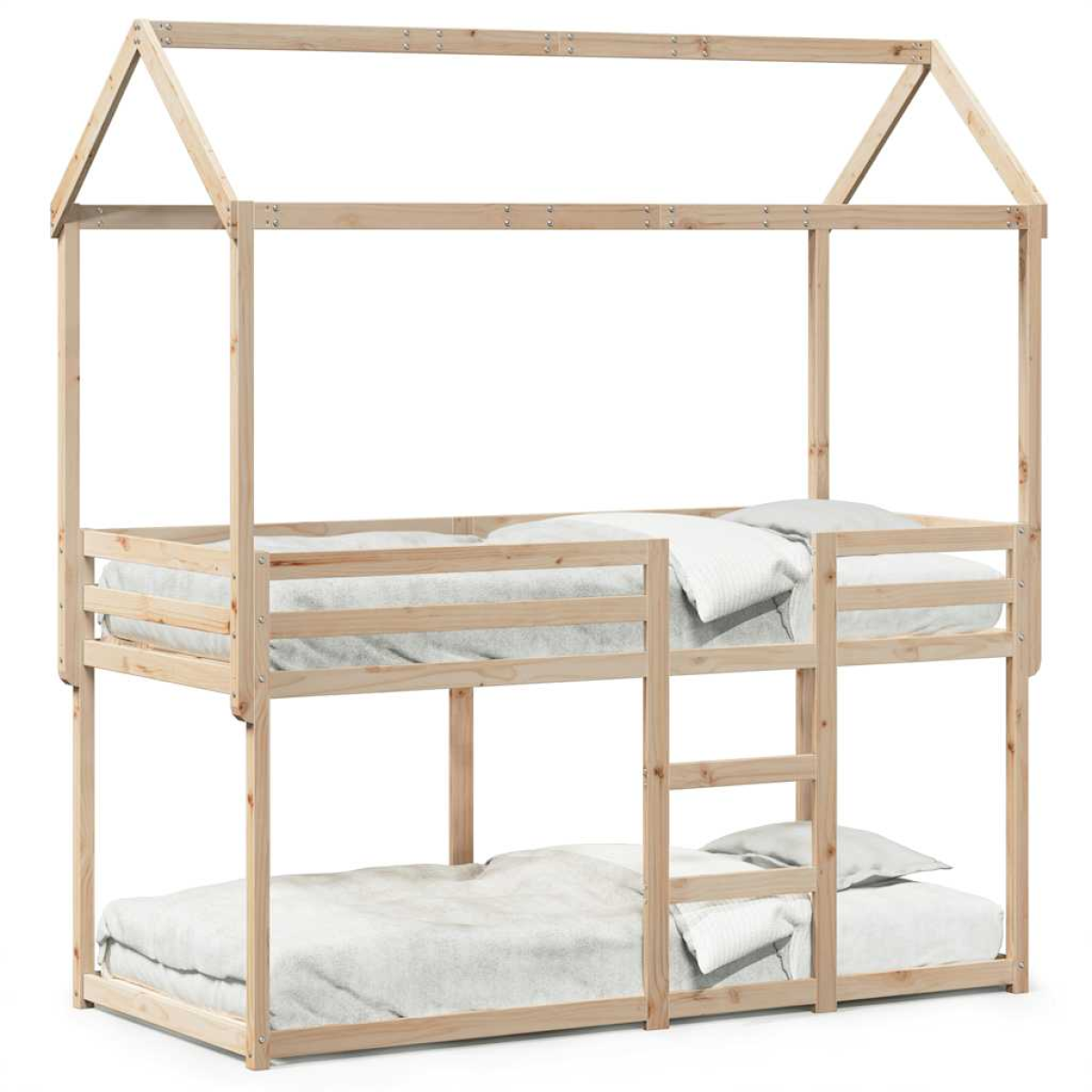 This kids' bunk bed with roof is elegant and functional, making it a perfect addition to any room with limited space. Solid pine wood: Solid pine wood is a beautiful natural material. Pine wood has a straight grain, and the knots give the material its signature, rustic look.Safe design: The loft bed is designed with safety in mind. It features guardrails to keep the user from rolling out while sleeping.Plywood slats: The plywood slats provide good weight distribution, ensuring that the mattress stays in place with every twist and turn of your body during sleep.Great fun: By combining the roof with your child's bed, you can create a hideaway that offers your kid lots of bedtime fun. This innovative addition will not only be a thrilling focal point but will also bring wonder and excitement to the kids' room.Suitable for limited space: The bed frame makes an excellent choice for any room with limited space, it provides two individual beds with compact design.Open side door: The roof features an open side door, providing easy access for your kids to get in and out of bed. Good to know:A mattress is not included with this bed. We do offer a various selection of mattresses. You can check our shop for a matching mattress.