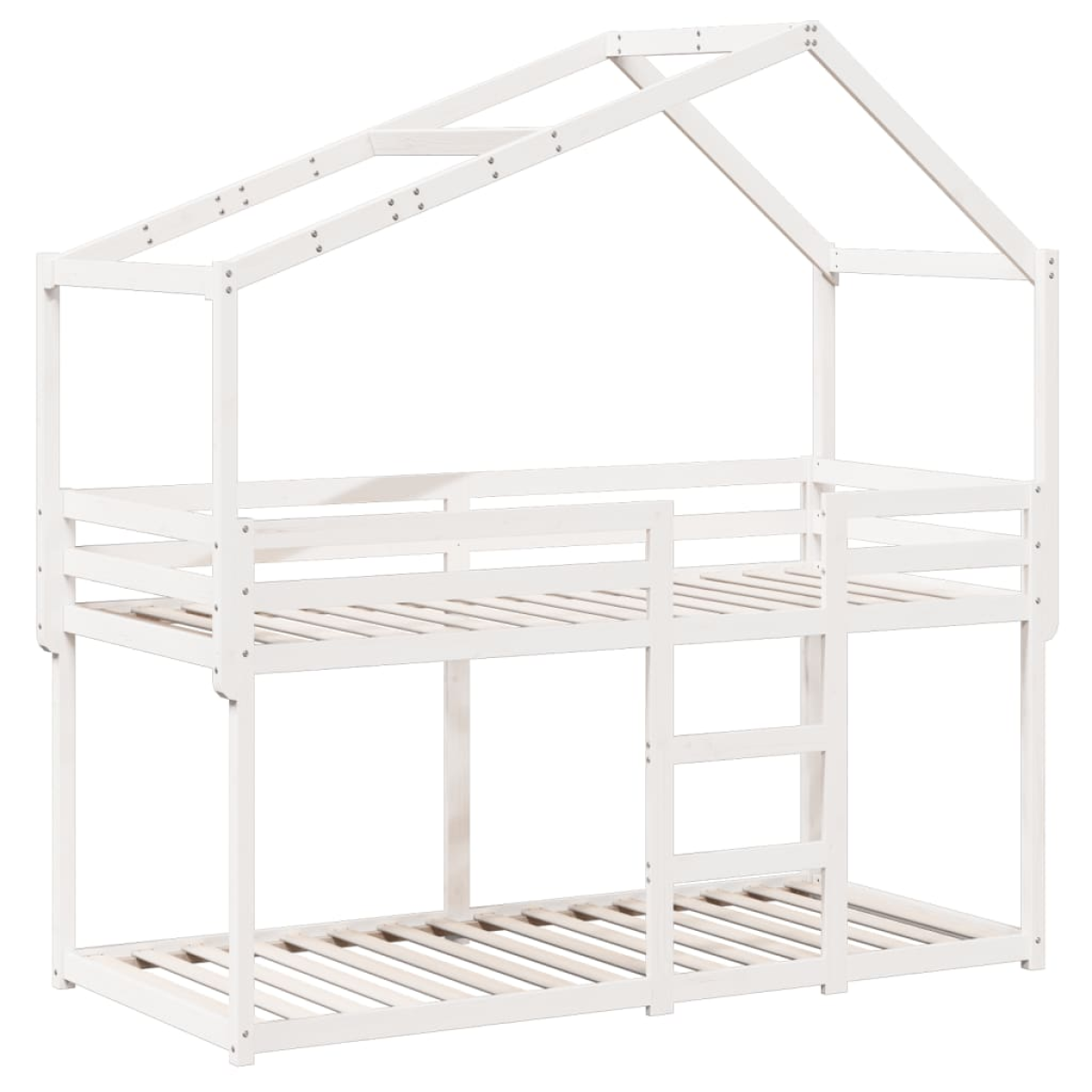 This kids' bunk bed with roof is elegant and functional, making it a perfect addition to any room with limited space. Solid pine wood: Solid pine wood is a beautiful natural material. Pine wood has a straight grain, and the knots give the material its signature, rustic look.Safe design: The loft bed is designed with safety in mind. It features guardrails to keep the user from rolling out while sleeping.Plywood slats: The plywood slats provide good weight distribution, ensuring that the mattress stays in place with every twist and turn of your body during sleep.Great fun: By combining the roof with your child's bed, you can create a hideaway that offers your kid lots of bedtime fun. This innovative addition will not only be a thrilling focal point but will also bring wonder and excitement to the kids' room.Suitable for limited space: The bed frame makes an excellent choice for any room with limited space, it provides two individual beds with compact design.Open side door: The roof features an open side door, providing easy access for your kids to get in and out of bed. Good to know:A mattress is not included with this bed. We do offer a various selection of mattresses. You can check our shop for a matching mattress.