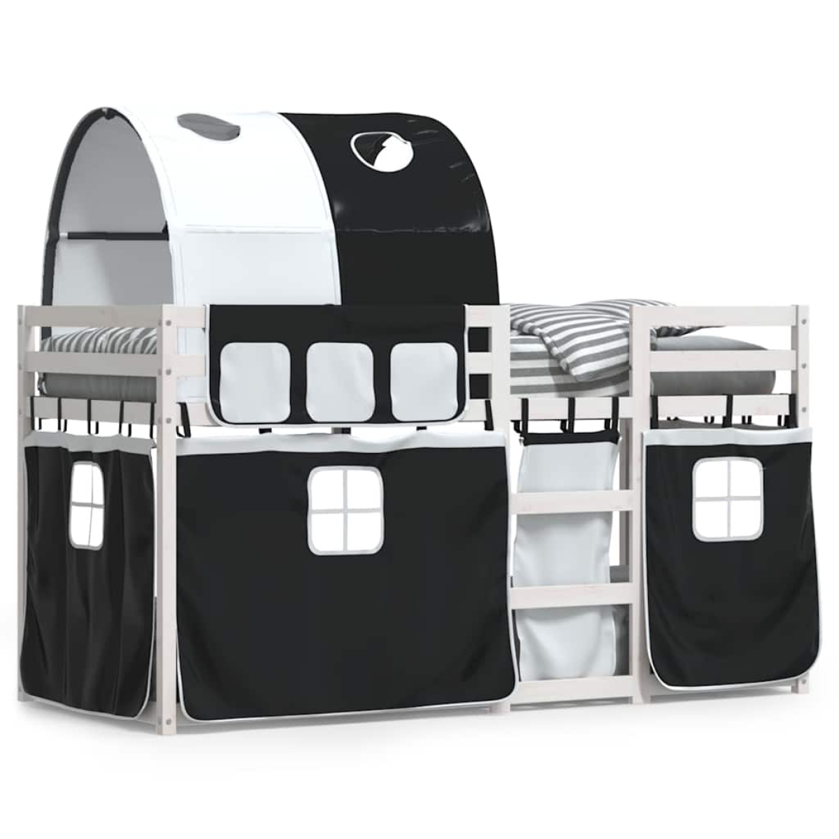 This wooden bunk bed is elegant and functional, making it a perfect addition to any room with limited space. Solid pine wood: This bunk bed is made of solid pine wood for stability and durability. Pine wood has a straight grain, and the knots give the material its signature, rustic look.Great fun: You can combine the curtains with the low bunk bed to create your child's secret base, providing great fun at bedtime and adding a focal point to the bedroom!Safety guardrails: The top bunk comes with safety guardrails on all 4 sides, so your child can sleep without worrying about falling off.Convenient ladder: This double bunk bed has a ladder that provides convenience for getting on and off the bed. It also brings joy and turns their room into an indoor playground. Good to know:A mattress is not included with this bed. We do offer a various selection of mattresses. You can check our shop for a matching mattress. Warning:To prevent it from tipping over, this product must be used with the provided wall attachment device.