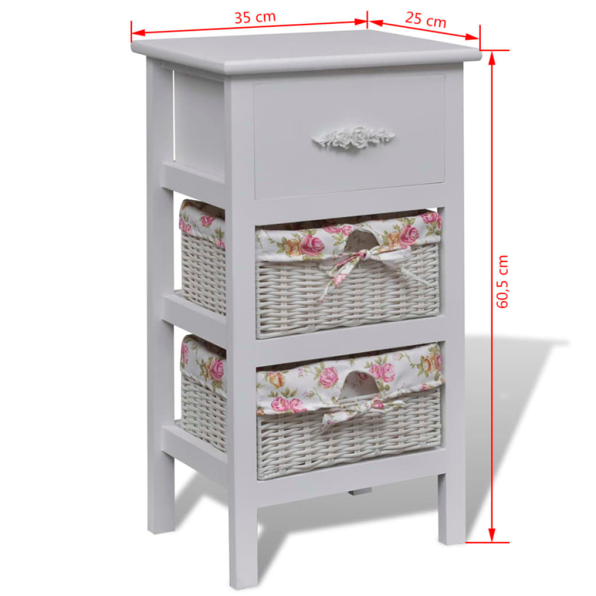 This wooden cabinet with one drawer and two baskets, made of high-quality wood, has a simple, yet stylish design. It will not only hold your things but also add a romantic touch to your decor. With one drawer and two baskets, this durable wooden cabinet has ample room for storing your valuables. Its wooden frame has a sturdy top panel on which you can put decorative items. Our wooden cabinet will be an eye-catcher in any room.
