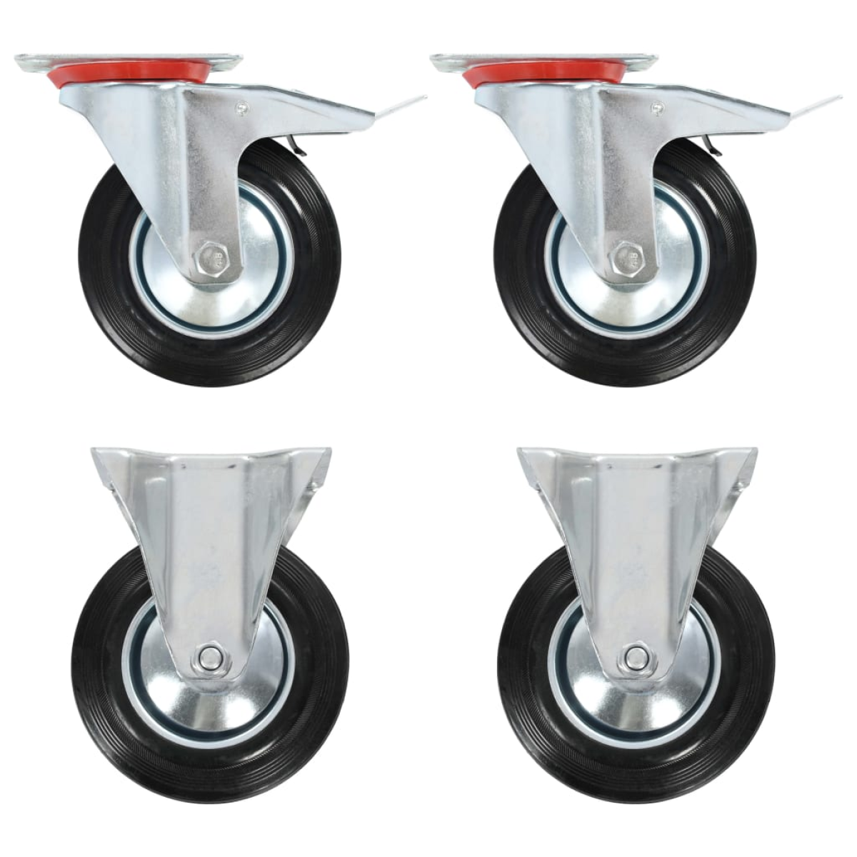 This set of 4 casters will be the perfect accessory for small equipment and furniture like workbench, trolley, coffee table, plant stand, bookshelf, shopping cart, etc. These casters are made of rubber which is distinguished by a good shock and vibration resistance, enabling these casters to run smoothly and quietly. Additionally, their soft surfaces effectively protect your floor from scratching. Besides, the zinc-coated iron frame is highly rust-resistant and thus adds to the catser's sturdiness and durability. Two of these swivel casters are equipped with double brakes for flexible control. Each caster has a maximum loading capacity of up to 150 kg. Delivery includes 2 fixed casters and 2 swivel casters with double brakes.