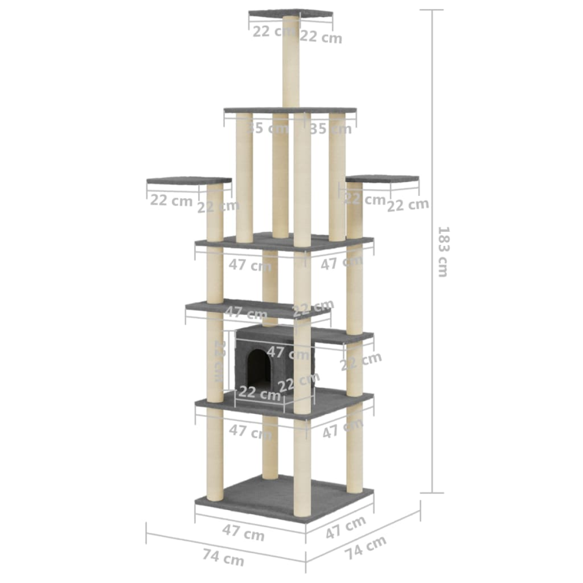 This cat tree is the perfect retreat for your cats to scratch, climb, perch, hide, and rest. It gives your cats the chance to stretch and exercise, especially in the cold winter months when they are stuck indoors. Your furry friends can sharpen their claws on the scratching posts wrapped in sisal rope, which provides a healthy outlet for their scratching instincts. Additionally, they will also rejoice in chasing after each other while jumping up and down this fun play centre. When they've enjoyed enough playtime, your little friends will love resting on the upper platforms where they have a better view. Besides, they can also hide in the cosy house to take a nap, or take a load off on the comfortable plush seat. With all these entertaining features, this cat tree will definitely become your furry friends' favourite hangout spot!