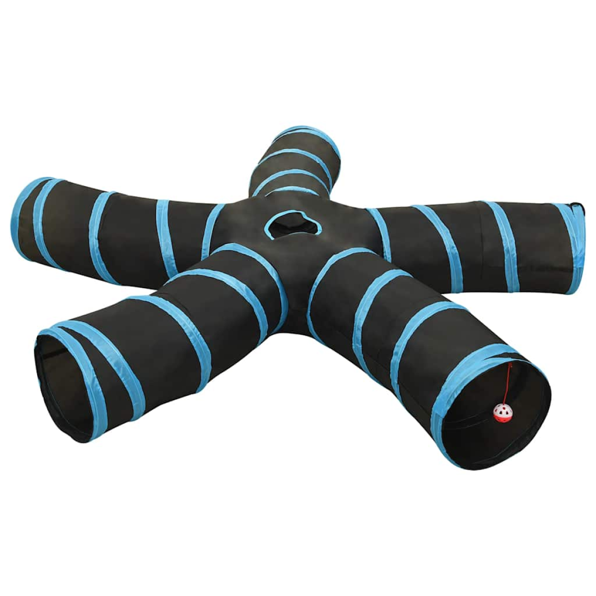 This cat tunnel with 5 ways gives your cats a mysterious field where they can do sports and have fun. Additionally, made of durable polyester, it’s suitable for both indoor and outdoor use. Durable material: Polyester is a synthetic material known for its UV resistance and its tensile strength. Polyester is water-resistant, making it the ideal choice for humid or rainy conditions and easy to clean.Sturdy frame: The kitten tunnel is supported by a sturdy and durable steel frame. So don't worry about deformations.Peephole: The interactive cat toy has a peephole at the top, which allows your pet to enter or exit freely, stick its head out to observe the outside, or give you a surprise attack.Fascinating playing space: The tunnel features built-in crackling paper, producing a fascinating sound when cats step on it. Additionally, a hanging ball at one entrance can pique your pet’s curiosity and excite it.S-type tunnel with 5 ways: The S-type can increase the puzzle better than the straight type. Together with the 5-way design, the cat play tunnel gives your pets more possible ways to play.Suitable for many animals: Not just cats, the cat tunnel toy is also suitable for other small pets such as puppies, rabbits, hamsters, and ferrets.Easy to store: The foldable kitten tunnel can be easily folded with an elastic band in seconds and stored in the included carry bag when not in use.
