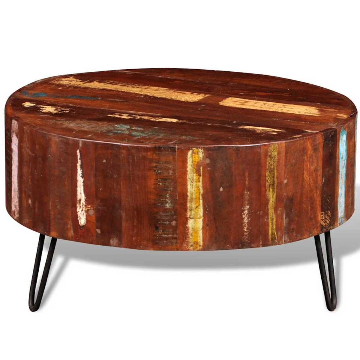 This antique-style reclaimed solid wooden coffee table is a timeless living accessory for your home. Its solid wood top provides a generous surface for placing your glasses, vases, fruits or ornaments on. And robust iron pin legs make the table stable and secure. This exotic coffee table is made from reclaimed wood, which means that every piece of furniture is unique and slightly different from each other. The furniture made from reclaimed wood has characteristics of different wood like teakwood, acacia, mango wood, saal wood etc. Reclaimed wood is solid, stable, durable and beautiful. The nail holes or clear-faced grains bring their history with them and invite another generation to permeate them with their own. Keeping this piece of furniture at home will show your concept of resource conservation, environment protection and sustainable development. Pure handmade craftsmanship adds the vintage spectacular style to the coffee table and feasts you with exoticism. Every process of recombining, polishing, painting and waxing is elaborately prepared. Relax with your family and friends around this unique and original coffee table! Important note: Colours vary from piece to piece, making each of our coffee tables unique. The delivery is random, ensuring the exclusivity and individuality of your product.
