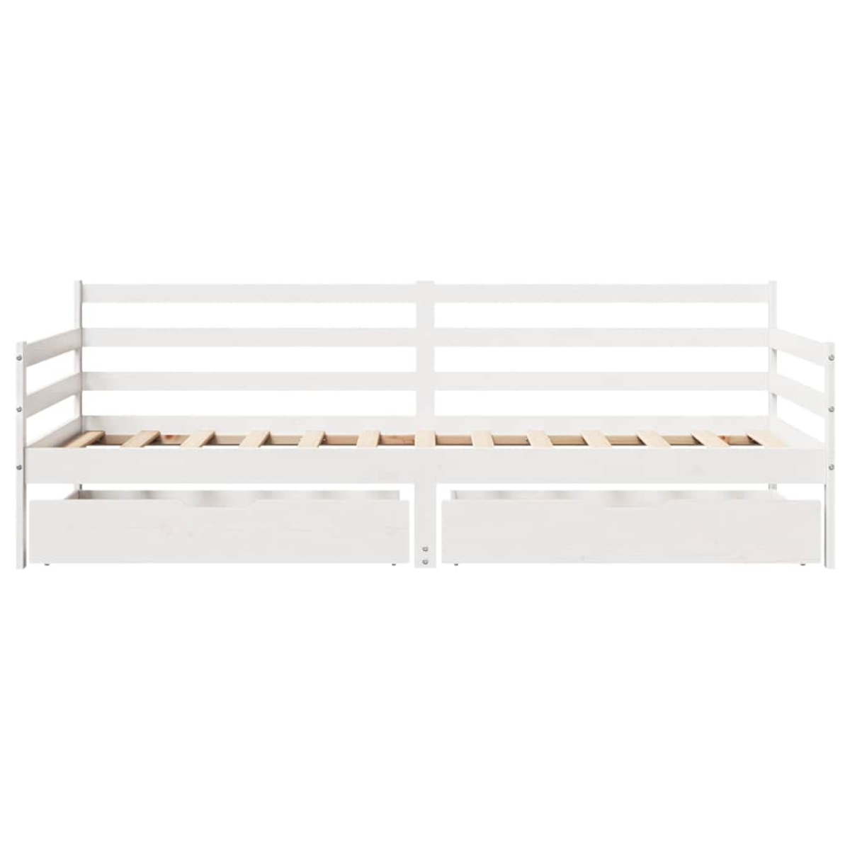 This 2-in-1 daybed with drawers, serving as both a sofa and bed, makes a practical and eye-catching addition to your living room or bedroom. Stable and long-lasting frame: Solid pinewood is known for its strength and durability. Its straight grains and distinctive knots contribute to its rustic charm.3-sided bed rails: This sleeper bed has a unique design on the side of the bed, providing a sense of security and also adding a touch of sophisticated style to your home.Slats for optimal support: The couch bed is complete with slats to offer essential support and breathability to your mattress.Rustic charm: The sofa bed gives your space rustic undertones that can be really relaxing. The calming effect of this wooden day bed turns any bedroom, guest room into a soothing place while adding a natural element to the room.Ample storage space: This guest bed has two drawers that provide ample space for storing your clothes, socks, toys, cushions, etc. Good to know:Mattresses are not included with this bed. We do offer a various selection of mattresses. You can check our shop for matching mattresses.