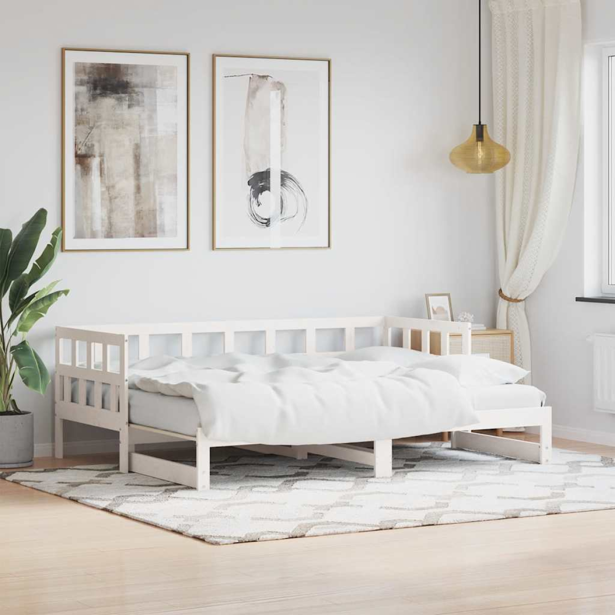 This 2-in-1 daybed with trundle, serving as both a sofa and bed, makes a practical and eye-catching addition to your living room or bedroom. Solid pinewood: Solid pine wood is a beautiful natural material. Pine wood has a straight grain, and the knots give the material its signature, rustic look. The guest bed is made of solid pine wood for stability and durability.Versatile daybed: The sofa bed functions as a sofa during the day and easily converts into a double bed at night by pulling out the trundle, providing a convenient solution for hosting guests and maximising space.Extra storage space: There is extra space under the daybed, allowing you to put drawers or storage boxes for storing your clothes, socks, toys, cushions, etc. Good to know:The delivery includes a daybed frame only. The mattress is not included. You can check our shop for the matching mattresses.