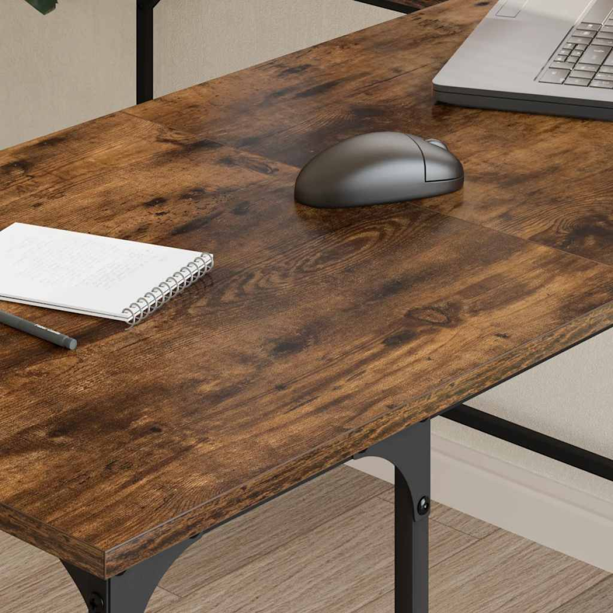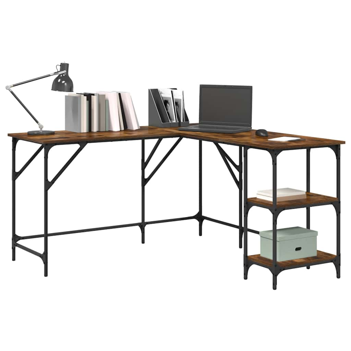This simplistic desk is meant to be a practical as well as a decorative choice for your living space! Durable material: The engineered wood is of exceptional quality with smooth surface and also features strength, stability and resistance to moisture. Made of engineered wood, the office desk is easy to clean.Ample storage space: This computer desk with shelves offers ample storage space to keep your computer, folders, documents, decorations and other essentials well organised and within reach.L-shaped design: The writing desk features an L-shaped design, making it easy to fit snugly in any corner to maximise your limited space.Adjustable feet: The adjustable feet with plastic pads keep the standing desk balanced on uneven ground and increase stability.Metal frame: The metal frame adds an industrial style to your interior while ensuring durability and stability. Warning:To prevent it being overturned, this product must be used with the provided wall attachment device.