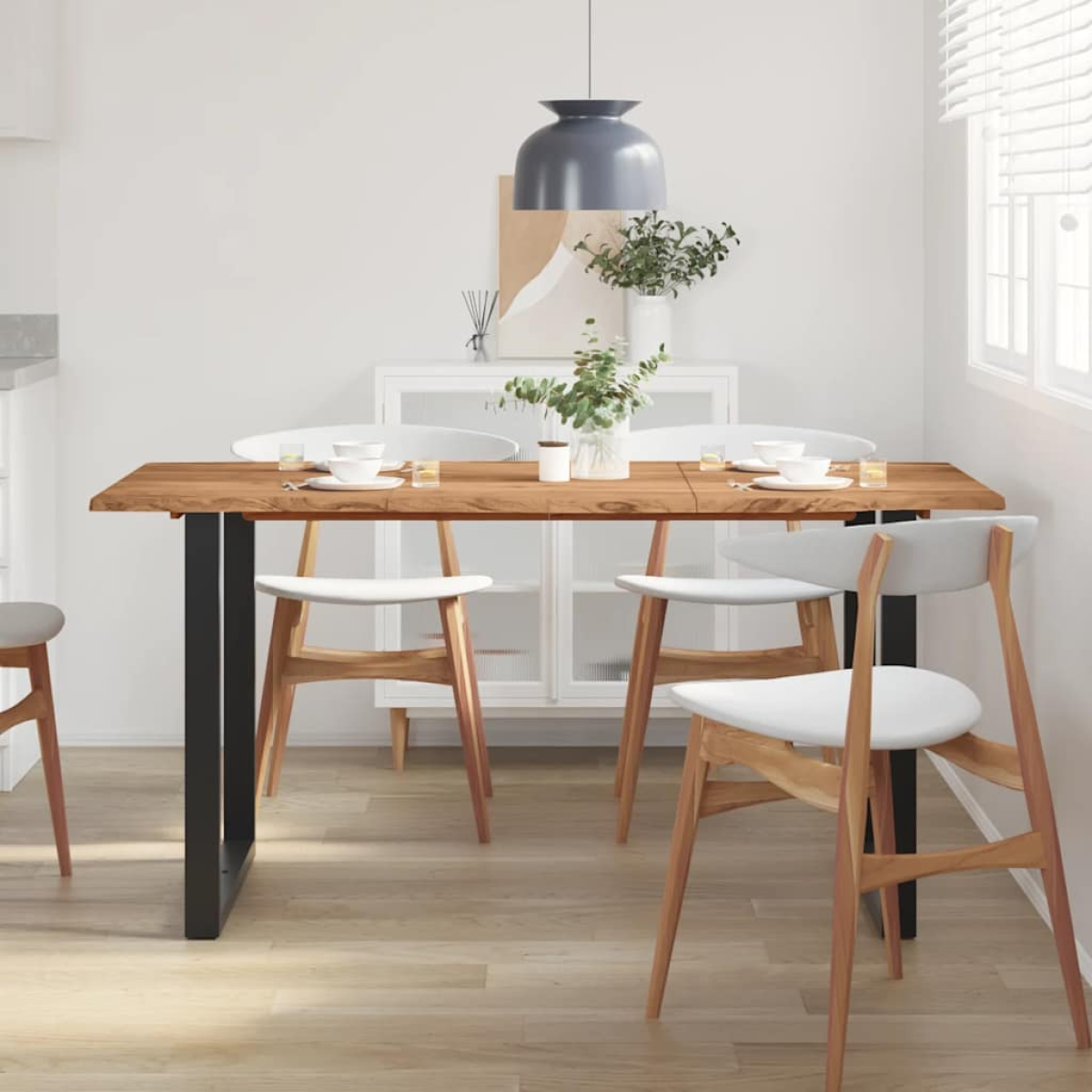 This wooden dining table with an industrial and rustic style will make a distinctive addition to your kitchen or dining room. This dining table is made of solid acacia wood, a tropical hardwood which is famous for its sturdiness and rich grains. The lively shape and edges of the tabletop are deliberately processed, so that the original character and natural impression of tree are brought to your interior decor! Each step of the process is carried out with the greatest care, be it polishing, painting or lacquering. The steel legs complete the industrial look and contribute to the sturdy construction. The dinner table is easy to assemble. Important note: The colours and edges vary from piece to piece, making each of the dining tables unique. The delivery is random, ensuring the exclusivity and individuality of your product.