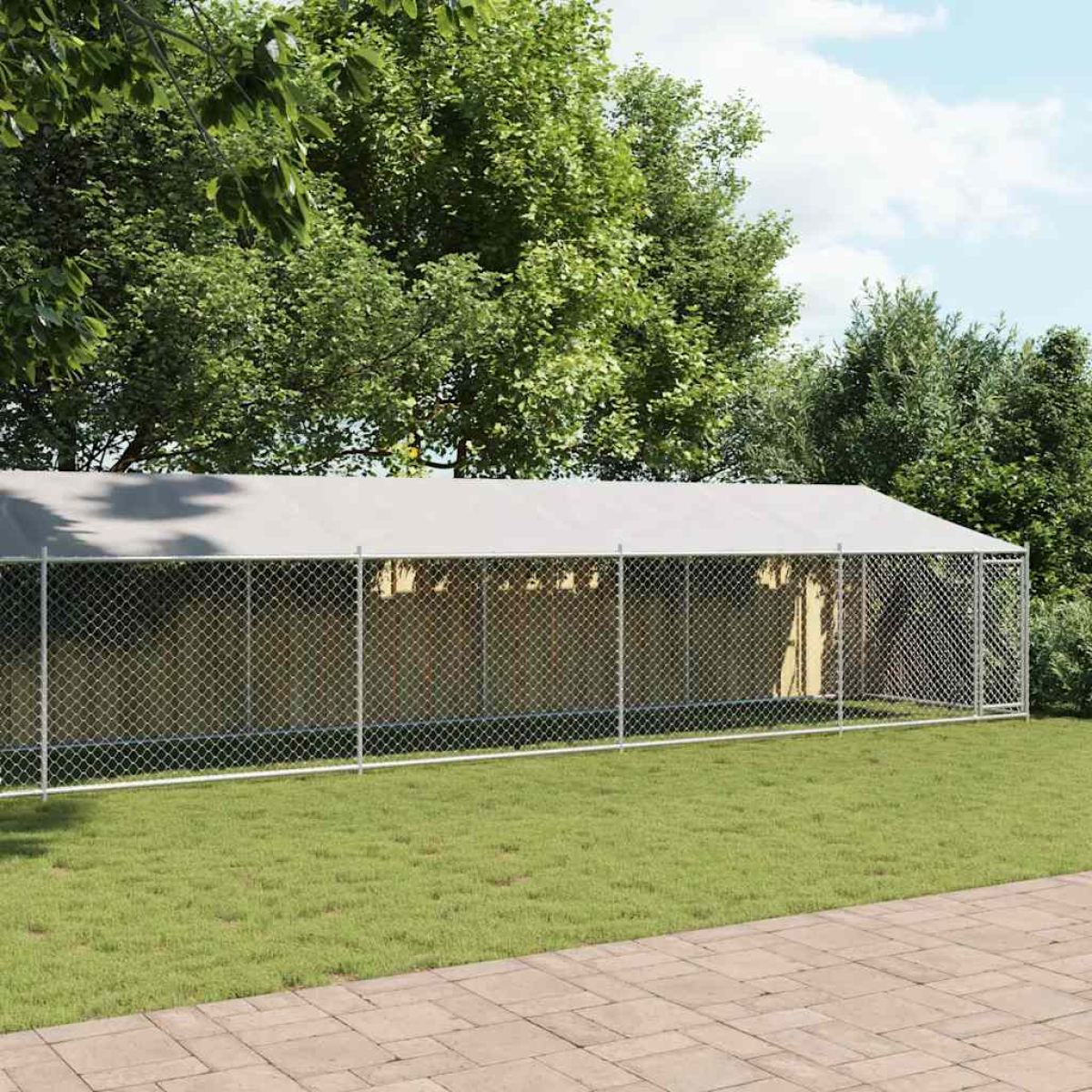 Keep your furry friends in a safe and comfortable space with this dog cage! Versatile use: The versatile dog kennel features multiple uses: playing, exercising, training, or simply keeping your dog safe. It will be the perfect play paradise for your animals!Durable construction: Thanks to the sturdy and heavy-duty galvanised steel construction, the dog pen is durable and built to last.Mesh design: The mesh design of the outdoor dog kennel helps prevent mischief and unexpected accidents while enabling ventilation.Practical roof: The roof of the metal dog crate is made of water-resistant fabric to provide your dog with shade and protection from light rain.Convenient access: The outside dog cage features a lockable door, making it easy to get in and out.Good to know:To prevent damage from heavy snow buildup, we recommend clearing the roof regularly during winter.