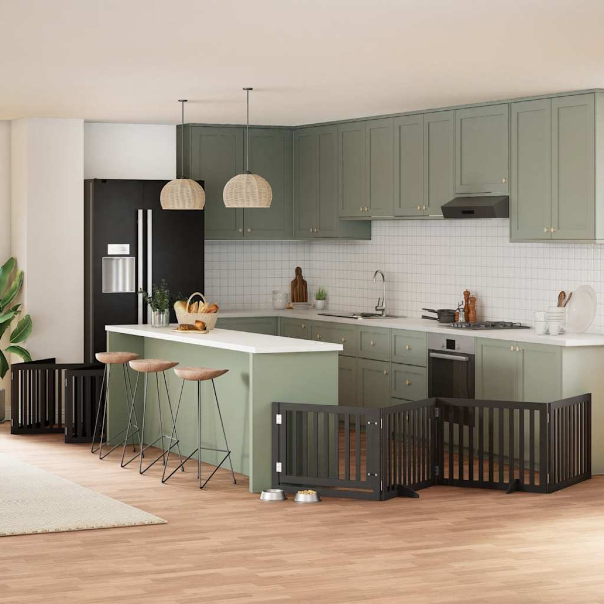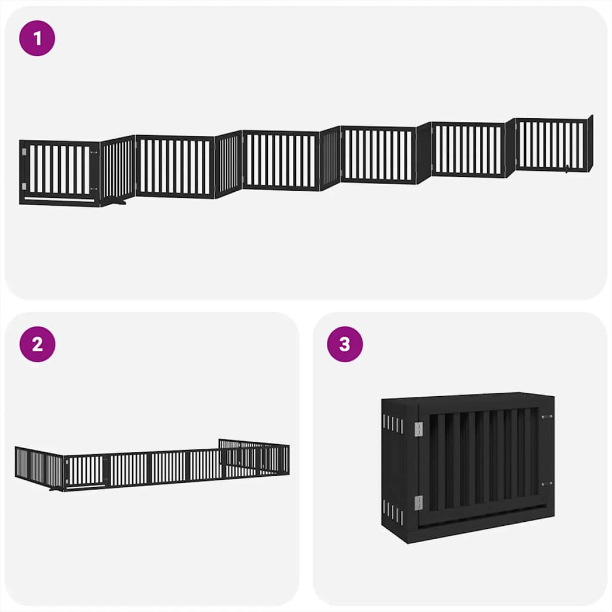 The dog gate puts your pet in a fixed activity area, which can keep your pet safe and prevent you from being disturbed. Durable material: The dog gate is made of poplar wood with water-base paint, making it durable, long-lasting, and easy to clean.Easy to use: The dog gate does not require installation or drilling that doesn't damage your home. This dog gate can be totally foldable when without feet, making it easy to carry and store in the closet or somewhere else.Practical design: The dog gate features two sturdy feet, providing stability and allowing for easy adjustments. Additionally, it includes a door panel and is equipped with locks, providing enhanced security and convenience for both you and your pets.Multiple applications: This dog gate can effectively prevent your pets from jumping over and getting through. Therefore, it is perfect for keeping your pets safe in the living room, kitchen, stairs, and doorway.