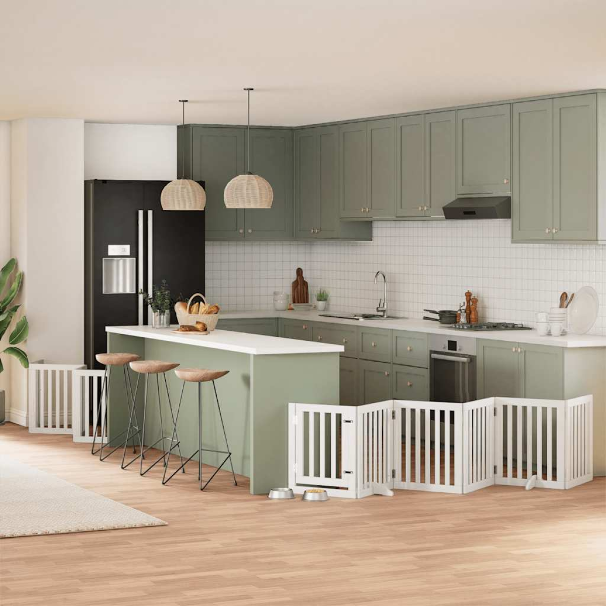 The dog gate puts your pet in a fixed activity area, which can keep your pet safe and prevent you from being disturbed. Durable material: The dog gate is made of poplar wood with water-base paint, making it durable, long-lasting, and easy to clean.Easy to use: The dog gate does not require installation or drilling that doesn't damage your home. This dog gate can be totally foldable when without feet, making it easy to carry and store in the closet or somewhere else.Practical design: The dog gate features two sturdy feet, providing stability and allowing for easy adjustments. Additionally, it includes a door panel and is equipped with locks, providing enhanced security and convenience for both you and your pets.Multiple applications: This dog gate can effectively prevent your pets from jumping over and getting through. Therefore, it is perfect for keeping your pets safe in the living room, kitchen, stairs, and doorway.