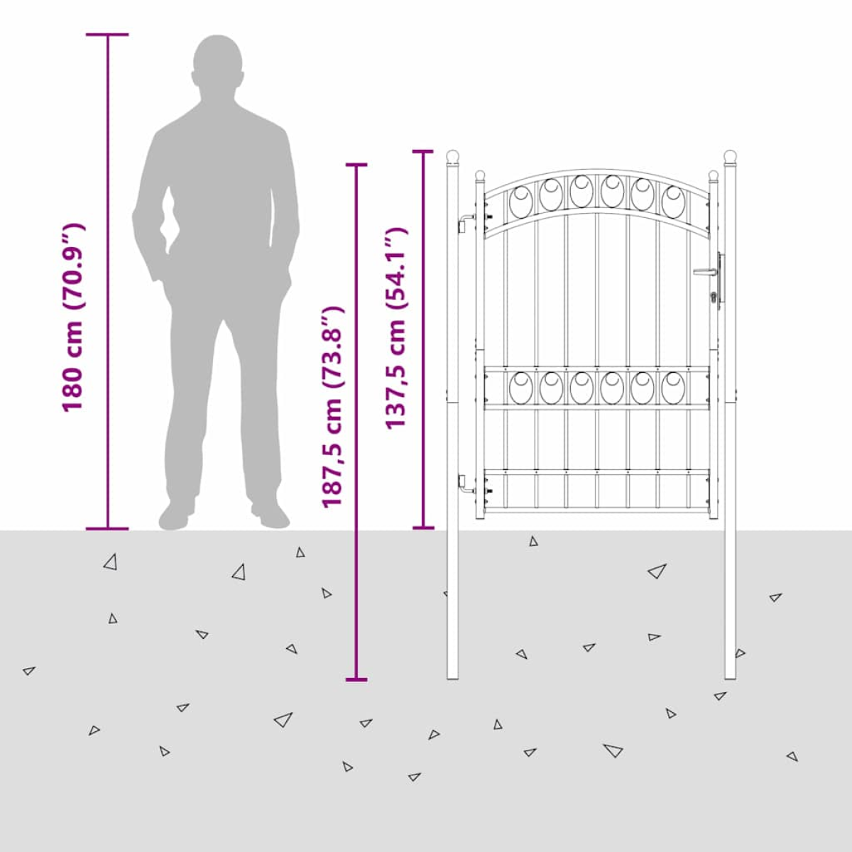 This modern Fence Gate crafted from powder-coated steel adds both security and aesthetic appeal to your outdoor space. Its arched top design and simple elegance make it a functional yet stylish addition to gardens or terraces. Suitable for use during spring and summer, it creates a charming gateway that can be used to define spaces or enhance the overall look of your outdoor area. Powder-Coated Steel: The fence gate features a robust, powder-coated steel construction that ensures longevity and resilience against outdoor elements. Its rust-resistant qualities make it well-suited for exposure to rain and humidity, maintaining its pristine appearance and strength season after season. Elegant Arched Top: The gate's design showcases a graceful arched top, adding an element of sophistication to both contemporary and traditional outdoor settings. This architectural feature not only enhances the visual interest of your outdoor space but also complements various garden designs. Included Components: Equip your outdoor area with a comprehensive package that includes a fence gate, two sturdy fence posts, reliable hinges, and three matching keys. These components work in harmony to ensure easy installation and reliable operation of the gate. Secure Deadbolt Locks: The gate is designed with strong deadbolt locks that provide a solid security measure for your property. These locks require a key for access, offering peace of mind and functionality in securing your garden or terrace. Care &Maintenance: Cleaning is simple and requires nothing more than a damp cloth to wipe down the gate, ensuring low maintenance and long-lasting satisfaction with its appearance. This straightforward upkeep guarantees your fence gate maintains its allure and effectiveness.