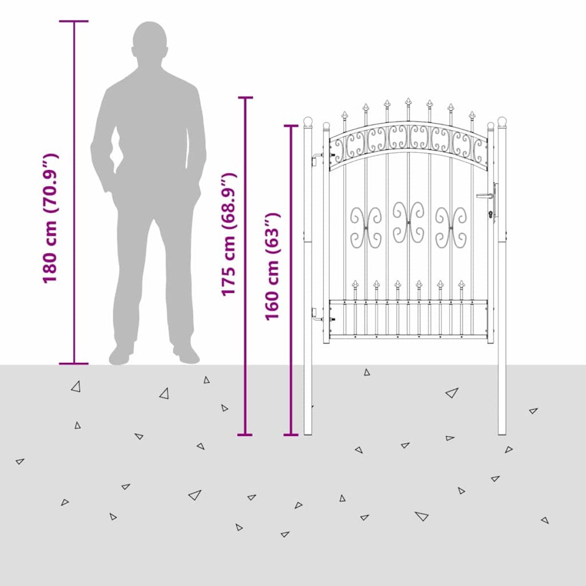 This traditional fence gate with an elegant spear top design offers a blend of style and security for your garden or terrace. Ideal for creating a defined yet open space, its classic details enhance any outdoor setting while offering a robust barrier. The gate's iconic spear shape adds visual depth and character, making it a striking addition to both contemporary and traditional homes. Quality Steel Composition Crafted from durable steel, this gate offers exceptional resilience against outdoor elements. Its robust nature complements its traditional look and ensures long-lasting utility, allowing it to maintain structural integrity across various weather conditions. Distinct Spear Design The spear top adds a touch of elegance to any setting, reminding of regal architecture with its impressive silhouette. The distinctive design provides both aesthetic appeal and enhanced security, a feature eagerly sought after by homeowners. Secured With Sliding Bolt Features a reliable sliding bolt lock that maximizes safety. This simplistic yet durable lock mechanism ensures the gate remains secure, minimizing unauthorized access while reinforcing the gate's utility in providing peace of mind. Traditional Touch Its traditional style is marked by detailed craftsmanship, embracing sumptuous touches that blend with classic garden landscapes beautifully. It introduces an old-world charm, perfect for outdoor spaces that desire a touch of elegance. Easy Care and Maintenance Maintain its polished look effortlessly. With simple care instructions like wiping with a damp cloth and avoiding abrasive cleaners, this gate promises to retain its appearance with minimal effort. Regular maintenance prolongs its lifespan.