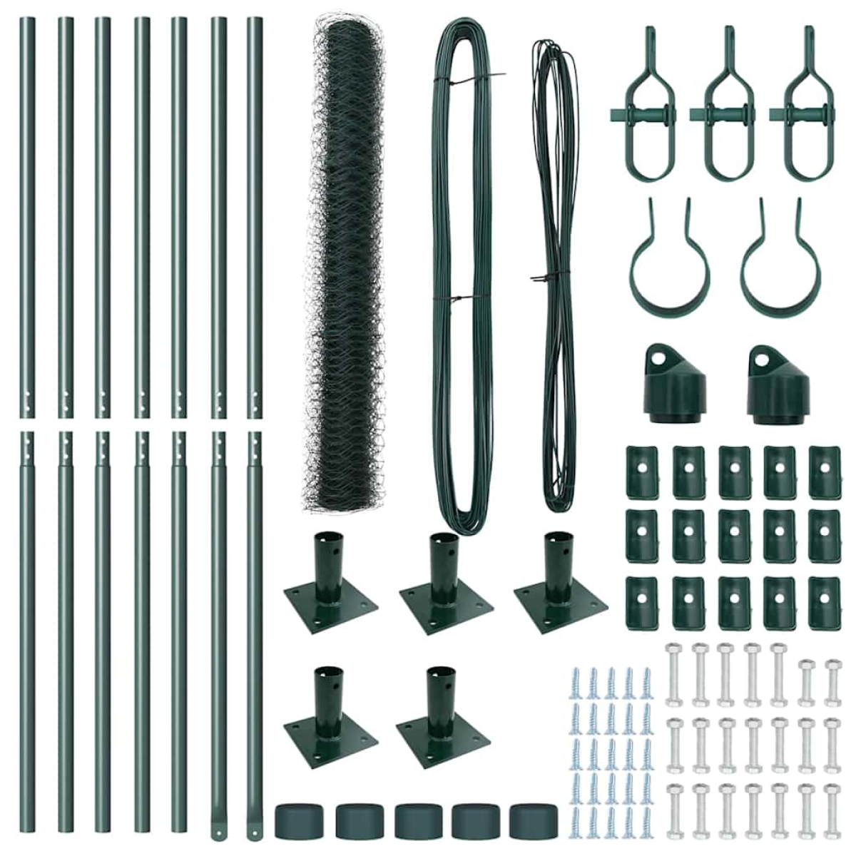 - 1 x Fence roll, 5 x Post, 2 x Angle post, 5 x Base plate, 5 x Plastic cap, 15 x Plastic tension wire supporter, 2 x Angle post cap, 2 x Angle post hardware, 3 x Tensioner, 1 x 25 m Binding wire, 1 x 33 m Tension wire