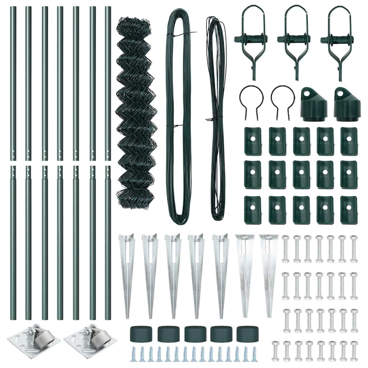 - 1 x Chain link fence, 5 x Post, 2 x Angle post, 5 x Spike, 2 x Angle spike, 5 x Plastic cap, 15 x Plastic tension wire supporter, 2 x Angle post cap, 2 x Angle post Hardware, 3 x Tensioner, 1 x 25m Binding wire, 1 x 33m Tension wire