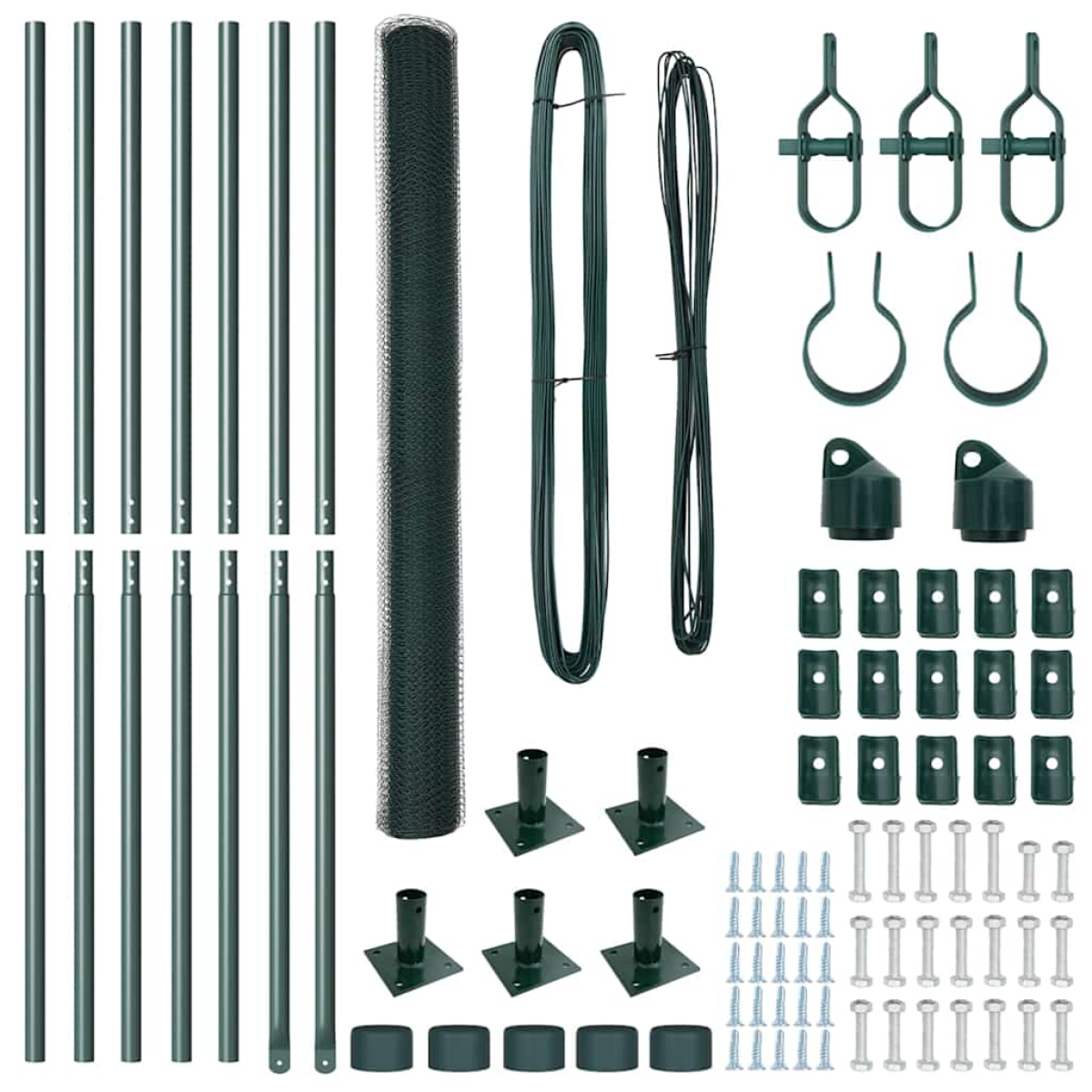 - 1 x Fence roll, 5 x Post, 2 x Angle post, 5 x Base plate, 5 x Plastic cap, 15 x Plastic tension wire supporter, 2 x Angle post cap, 2 x Angle post hardware, 3 x Tensioner, 1 x 25 m Binding wire, 1 x 33 m Tension wire