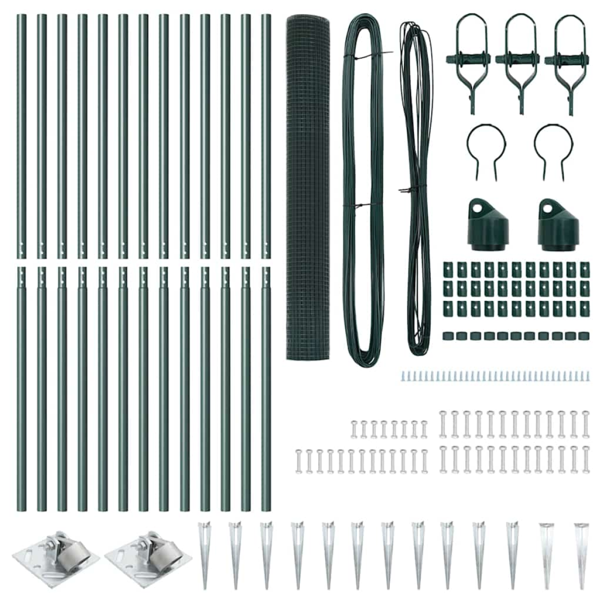 - 1 x Fence roll, 11 x Post, 2 x Angle post, 11 x Spike, 2 x Angle spike, 11 x Plastic cap, 33 x Plastic tension wire supporter, 2 x Angle post cap, 2 x Angle post hardware, 3 x Tensioner, 1 x 25 m Binding wire, 1 x 80 m Tension wire