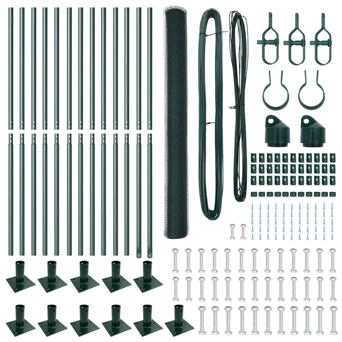 - 1 x Fence roll, 11 x Post, 2 x Angle post, 11 x Base plate, 11 x Plastic cap, 33 x Plastic tension wire supporter, 2 x Angle post cap, 2 x Angle post hardware, 3 x Tensioner, 1 x 25 m Binding wire, 1 x 80 m Tension wire