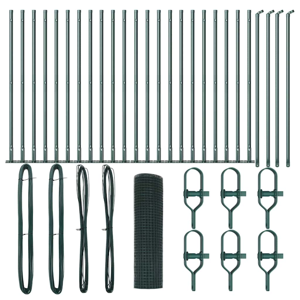 - 1 x Fence roll, 22 x Post, 4 x Angle post, 22 x Base plate, 22 x Plastic cap, 66 x Plastic tension wire supporter, 4 x Angle post cap, 4 x Angle post hardware, 6 x Tensioner, 2 x 25 m Binding wire, 2 x 80 m Tension wire
