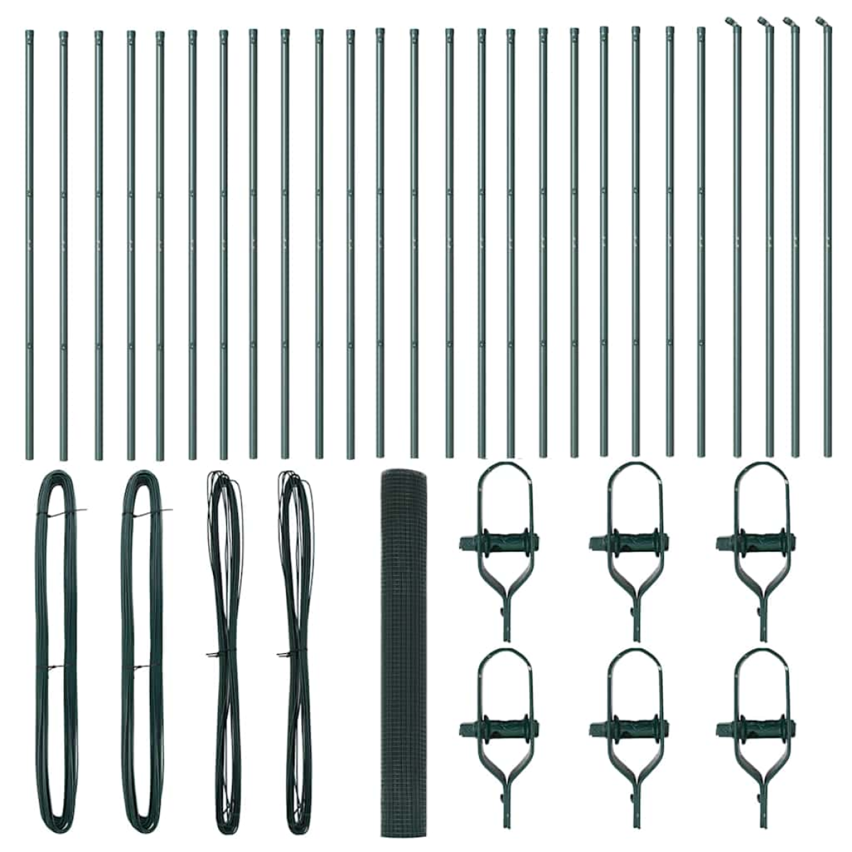 • 1 x Fence roll, 22 x Post, 4 x Angle post, 22 x Plastic cap, 66 x Plastic tension wire supporter, 4 x Angle post cap, 4 x Angle post hardware, 6 x Tensioner, 2 x 25 m Binding wire, 2 x 80 m Tension wire