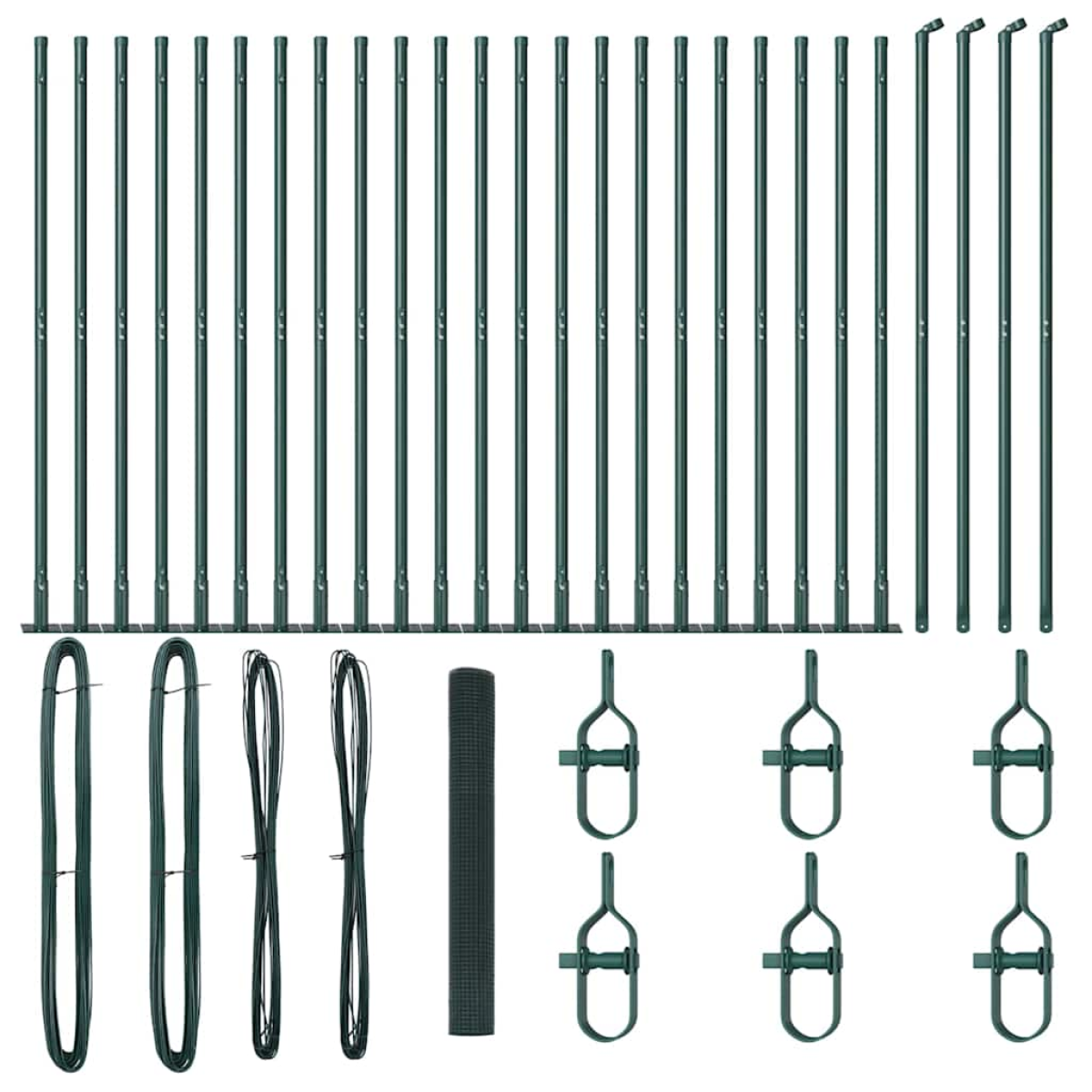 - 1 x Fence roll, 22 x Post, 4 x Angle post, 22 x Base plate, 22 x Plastic cap, 66 x Plastic tension wire supporter, 4 x Angle post cap, 4 x Angle post hardware, 6 x Tensioner, 2 x 25 m Binding wire, 2 x 80 m Tension wire