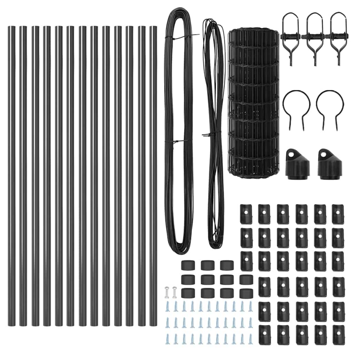 - Fence post components, Mesh roll, Wire ties