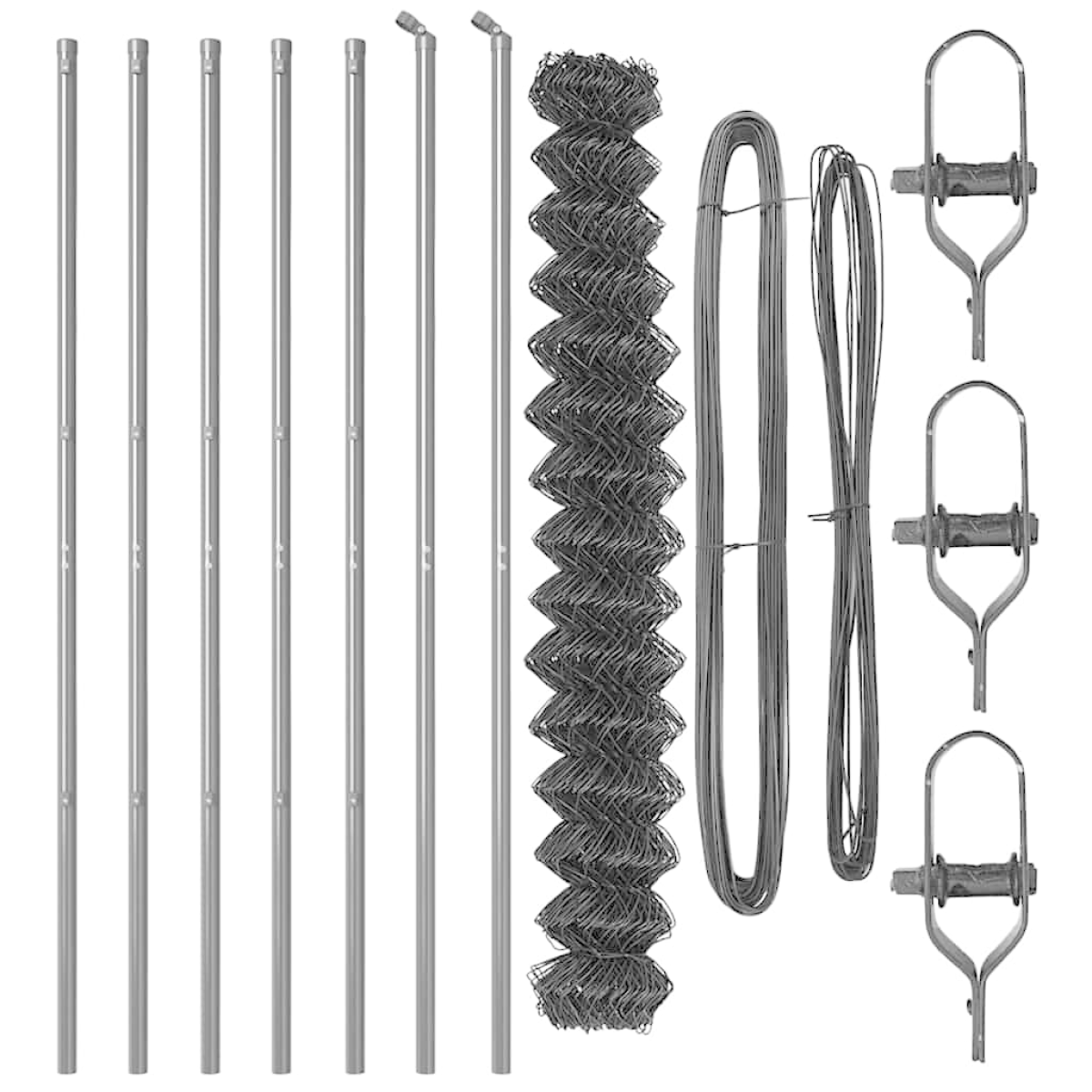 • 1 x Chain link fence, 5 x Post, 2 x Angle post, 5 x Plastic cap, 15 x Plastic tension wire supporter, 2 x Angle post cap, 2 x Angle post hardware, 3 x Tensioner, 1 x 25 m Binding wire, 1x 33 m Tension wire