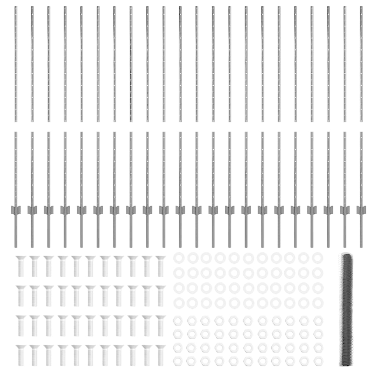 - 1 x Fence roll, 88 x Post, 1 x Set of screws and bolts