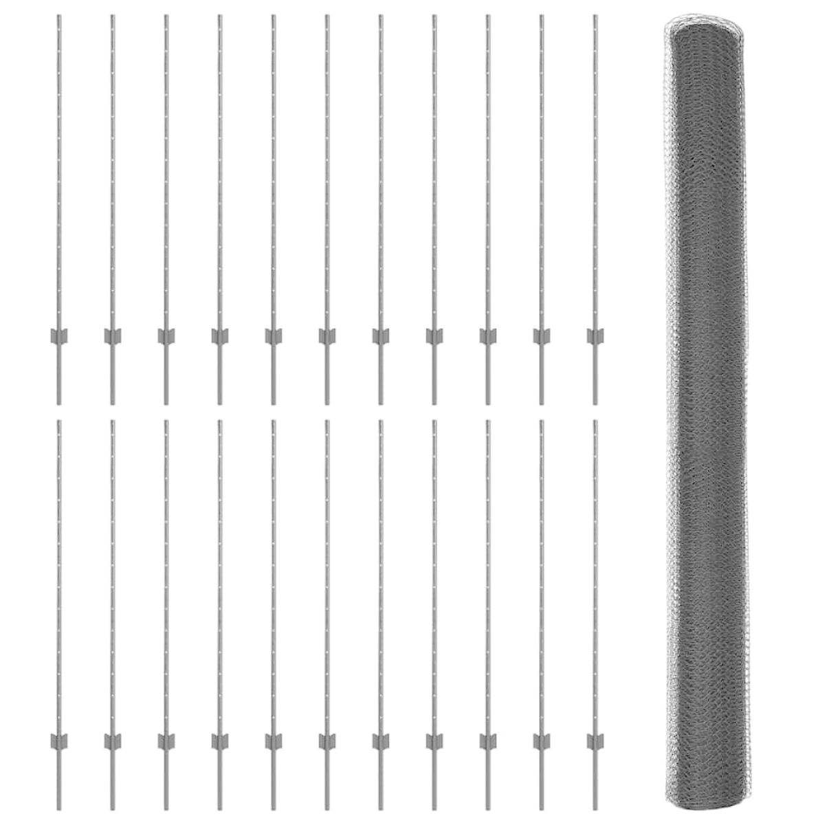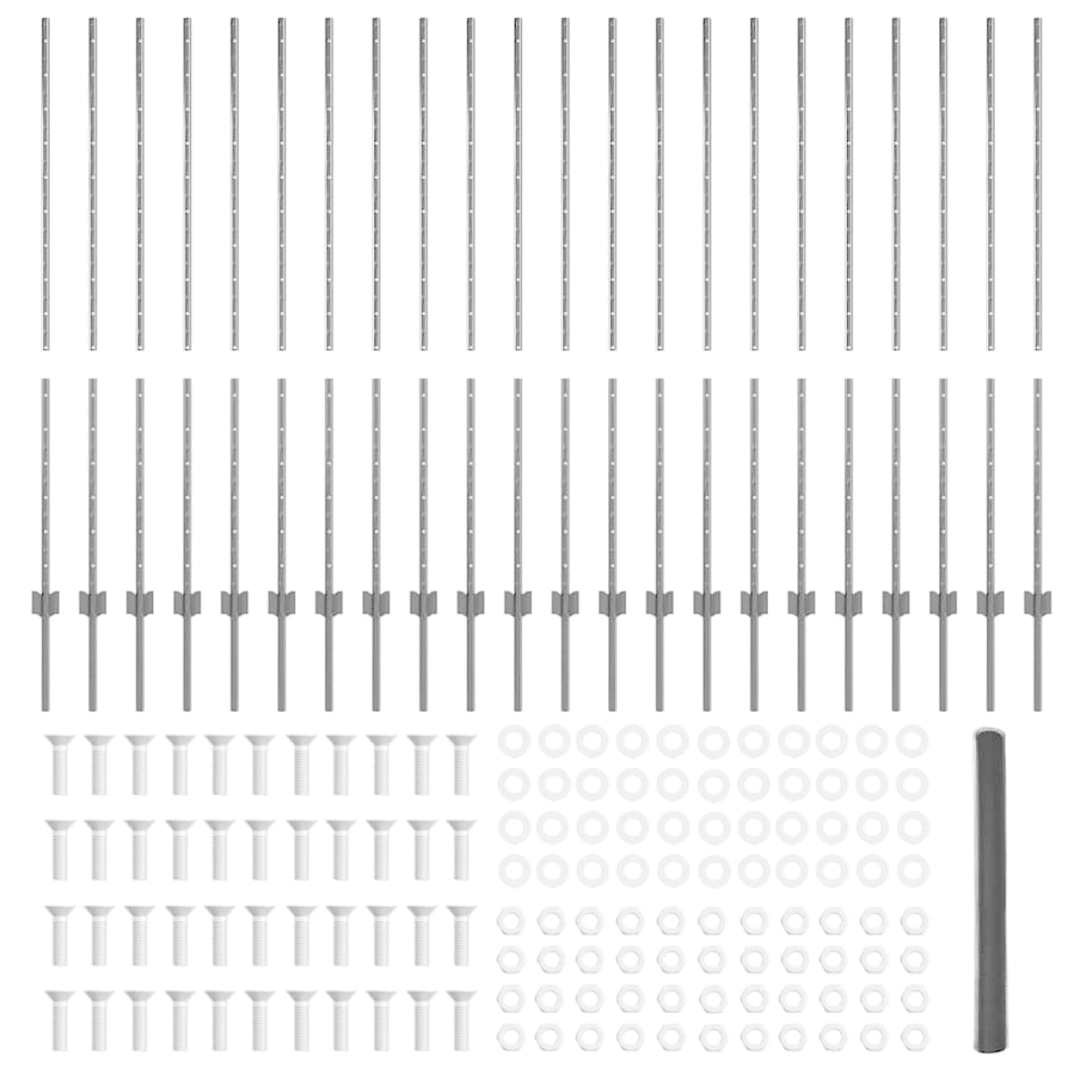 - 1 x Fence roll, 88 x Post, 1 x Set of screws and bolts