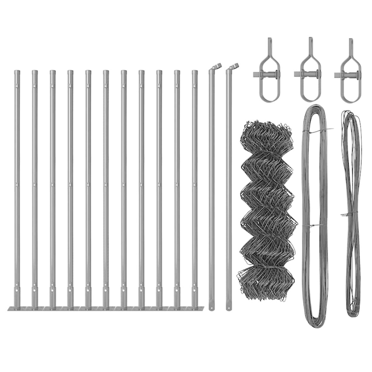 - 1 x Chain link fence, 11 x Post, 2 x Angle post, 11 x Base plate, 11 x Plastic cap, 33 x Plastic tension wire supporter, 2 x Angle post cap, 2 x Angle post hardware, 3 x Tensioner, 1 x 25 m Binding wire, 1 x 80 m Tension wire