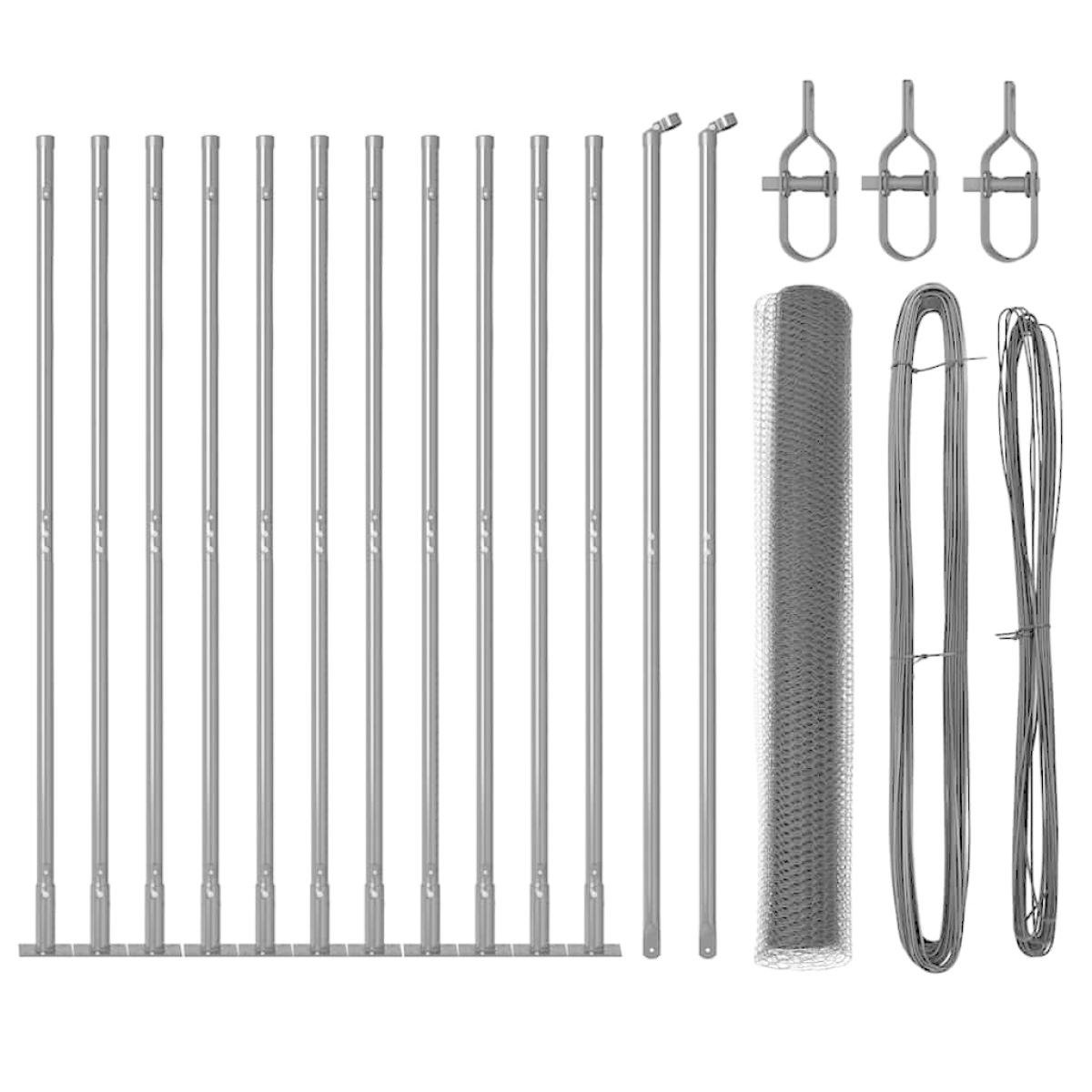 - 1 x Fence roll, 11 x Post, 2 x Angle post, 11 x Base plate, 11 x Plastic cap, 33 x Plastic tension wire supporter, 2 x Angle post cap, 2 x Angle post hardware, 3 x Tensioner, 1 x 25 m Binding wire, 1 x 80 m Tension wire