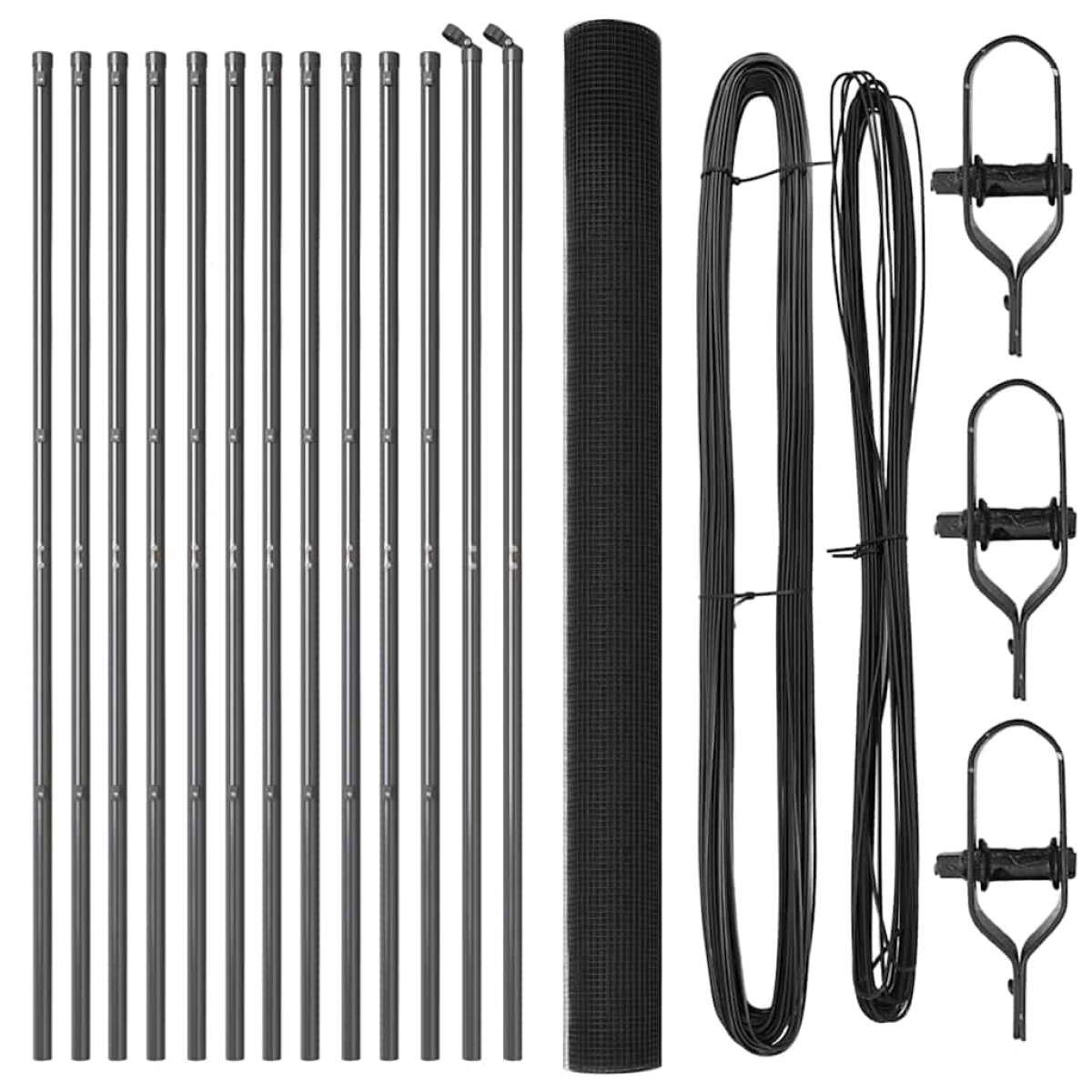 - 1 x Fence roll, 11 x Post, 2 x Angle post, 11 x Plastic cap, 33 x Plastic tension wire supporter, 2 x Angle post cap, 2 x Angle post hardware, 3 x Tensioner, 1 x 25 m Binding wire, 1 x 80 m Tension wire