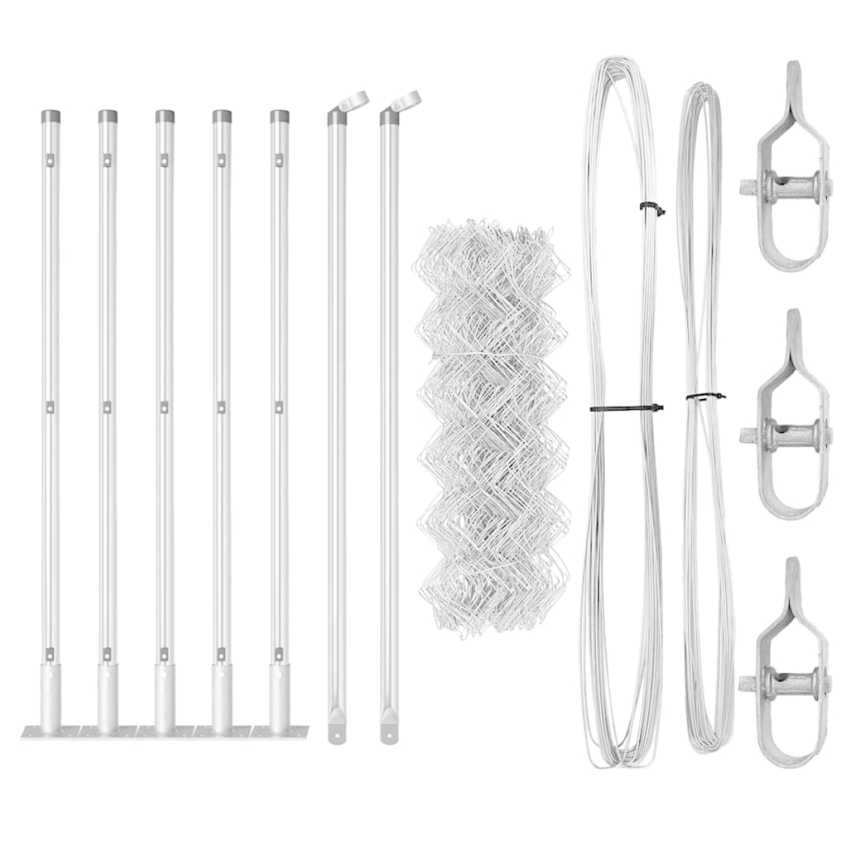 - 1 x Chain link fence, 5 x Post, 2 x Angle post, 5 x Base plate, 5 x Plastic cap, 15 x Plastic tension wire supporter, 2 x Angle post cap, 2 x Angle post hardware, 3 x Tensioner, 1 x 25 m Binding wire, 1 x 33 m Tension wire