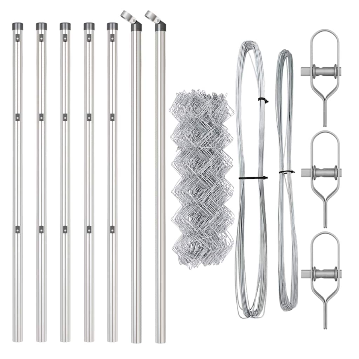 - 1 x Chain link fence, 5 x Post, 2 x Angle post, 5 x Plastic cap, 15 x Plastic tension wire supporter, 2 x Angle post cap, 2 x Angle post hardware, 3 x Tensioner, 1 x 25 m Binding wire, 1x 33 m Tension wire