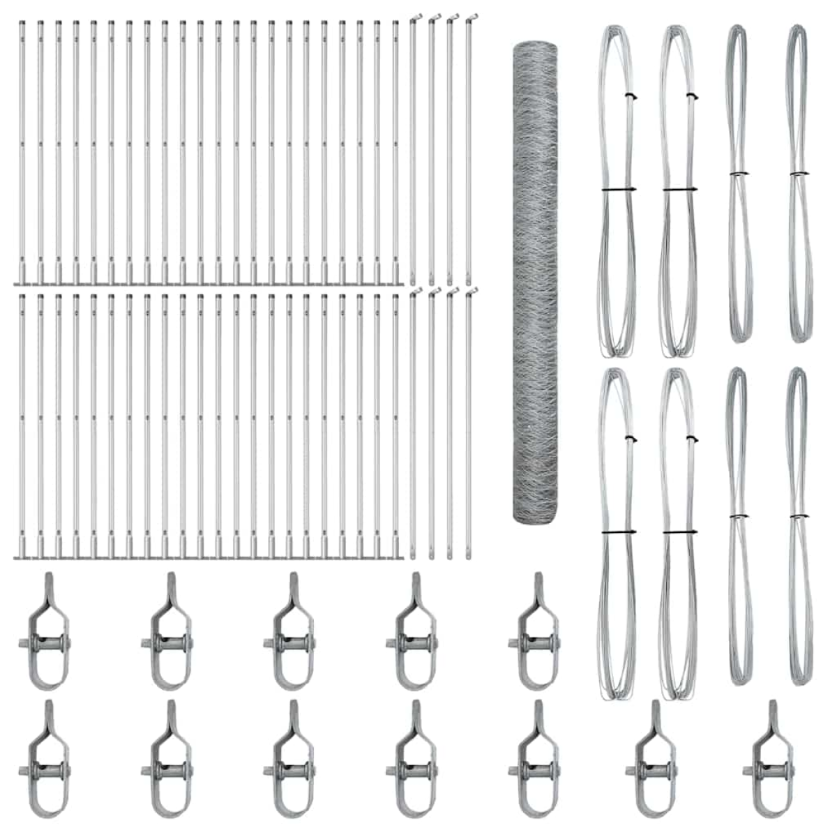 - 1 x Fence roll, 44 x Post, 8 x Angle post, 44 x Base plate, 44 x Plastic cap, 132 x Plastic tension wire supporter, 8 x Angle post cap, 8 x Angle post hardware, 12 x Tensioner, 4 x 25 m Binding wire, 4 x 80 m Tension wire