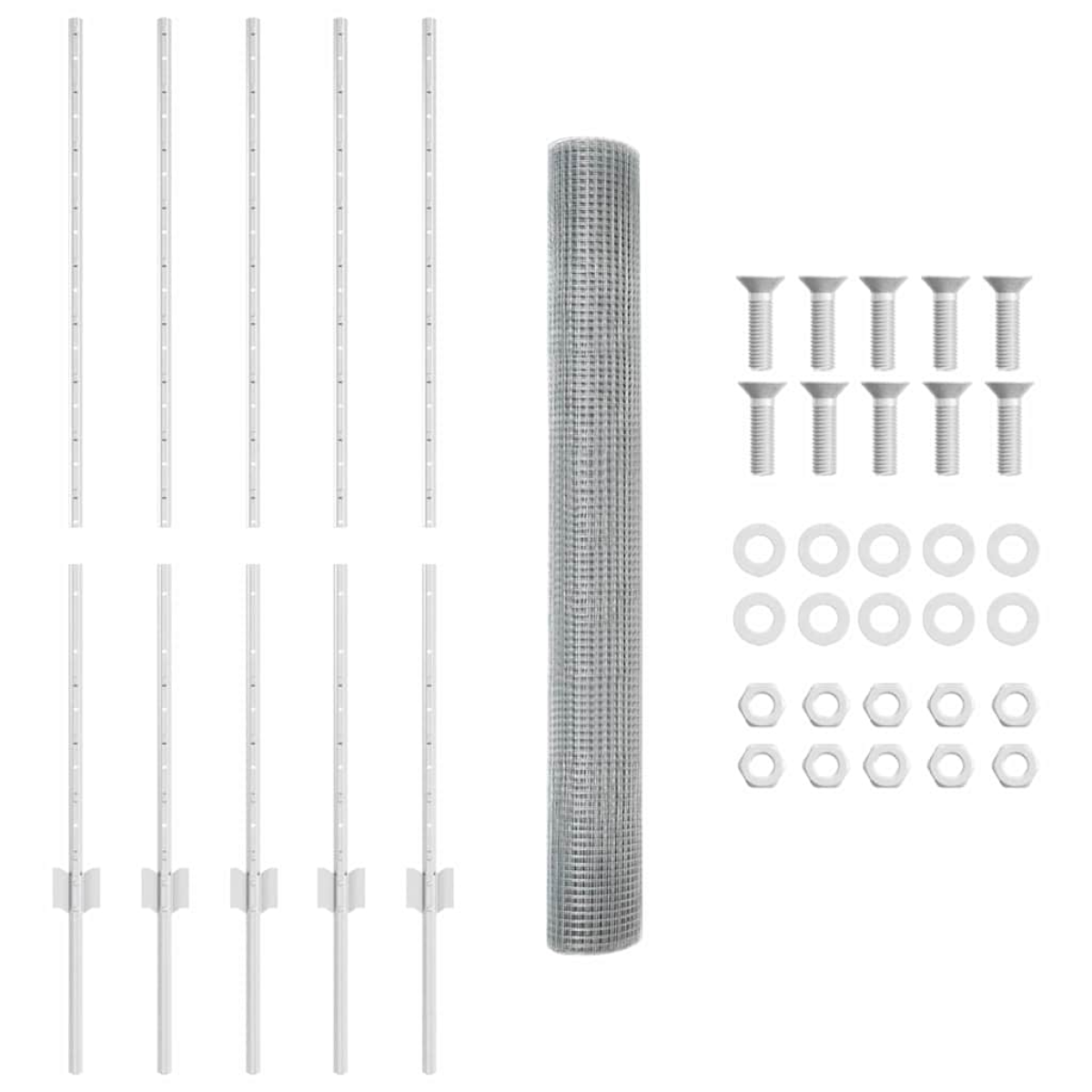 - 1 x Fence roll, 20 x Post, 1 x Set of screws and bolts