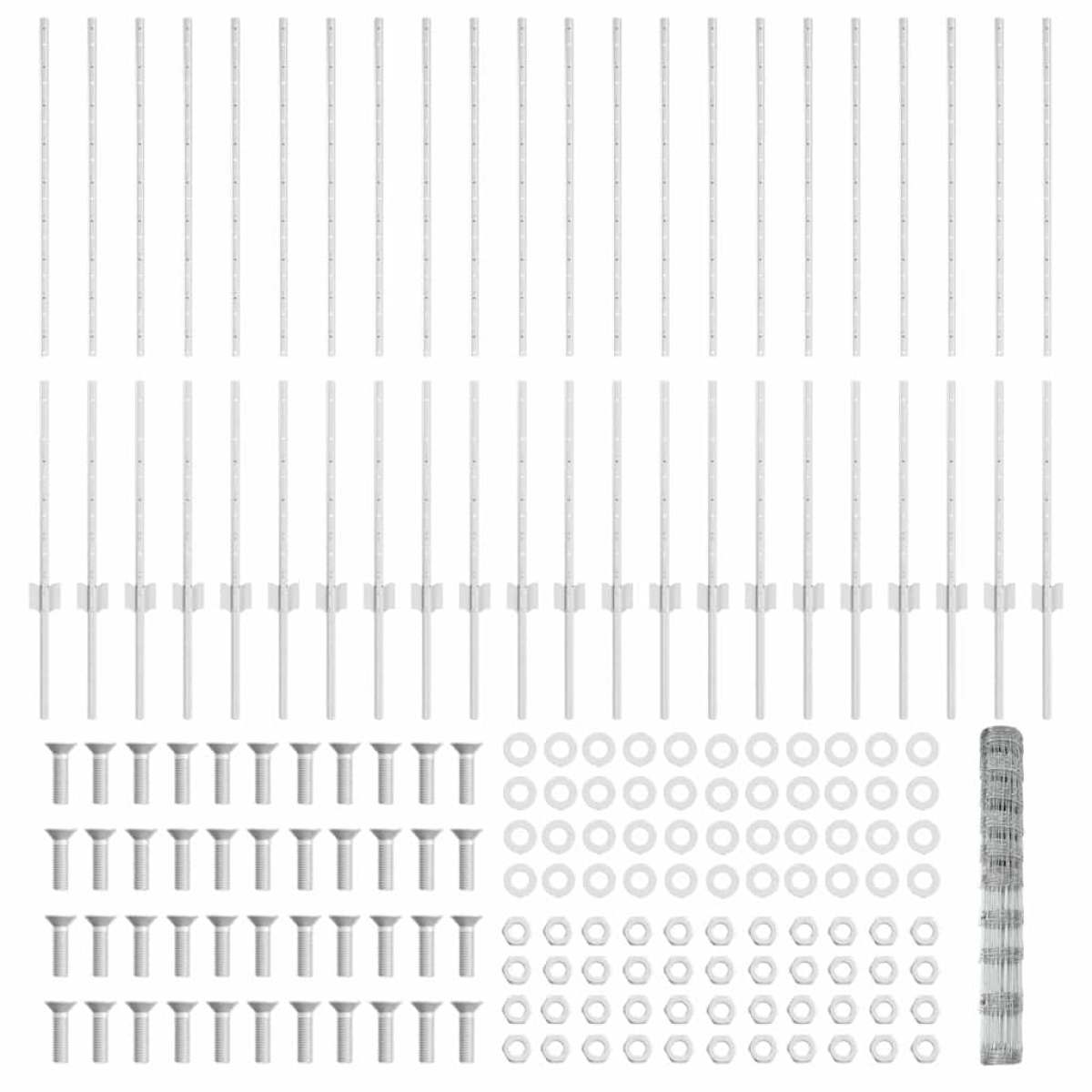 • 1 x Fence roll, 88 x Post, 1 x Set of screws and bolts