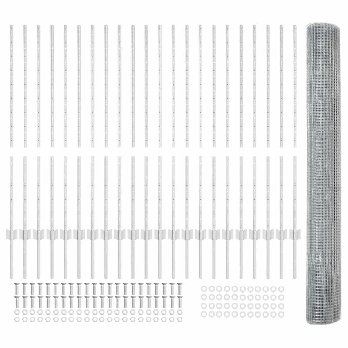 • 1 x Fence roll, 88 x Post, 1 x Set of screws and bolts