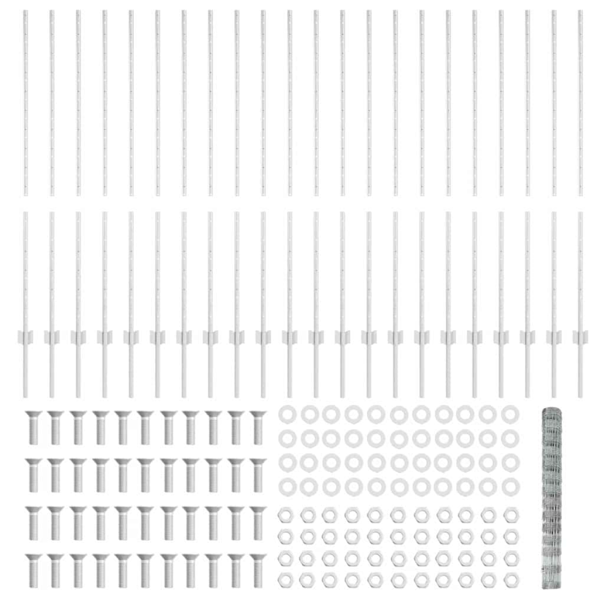 - 1 x Fence roll, 88 x Post, 1 x Set of screws and bolts