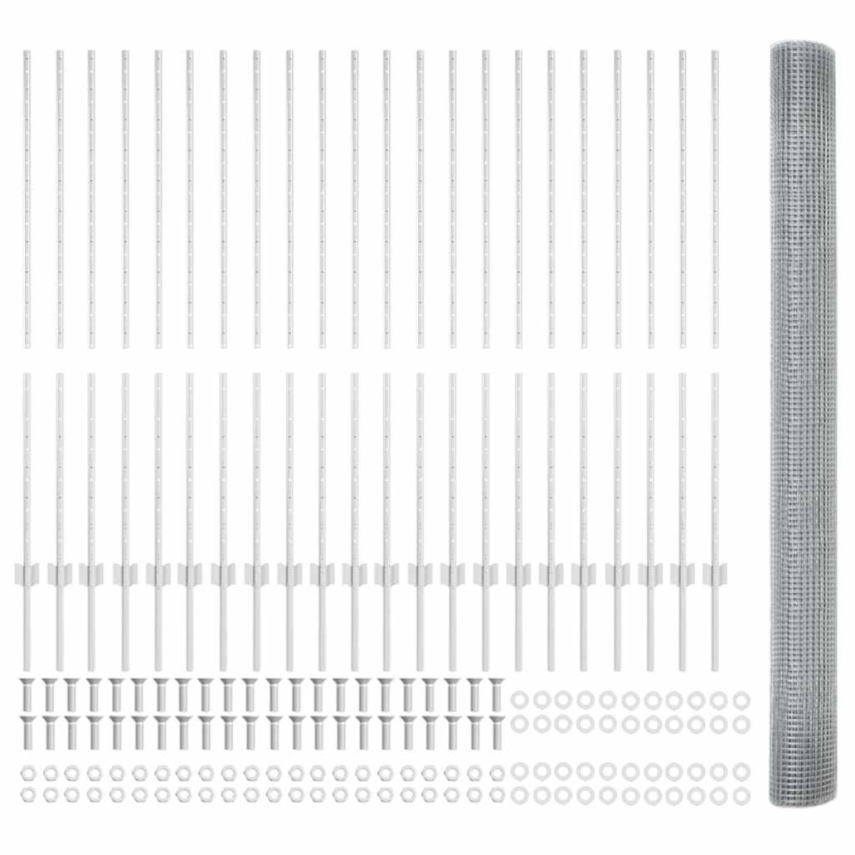- 1 x Fence roll, 88 x Post, 1 x Set of screws and bolts