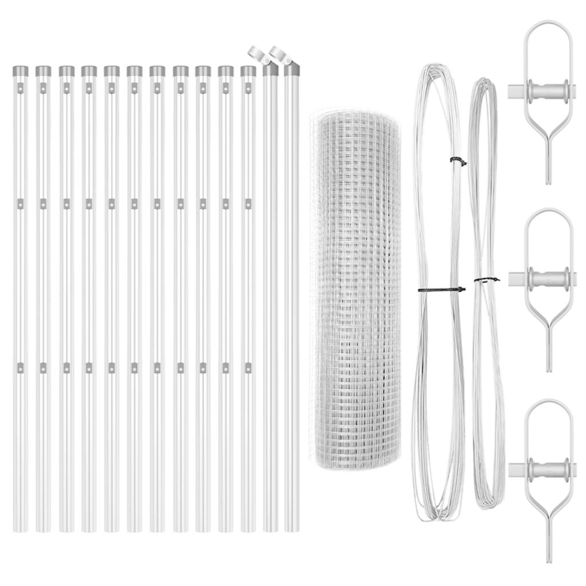 - 1 x Fence roll, 11 x Post, 2 x Angle post, 11 x Plastic cap, 33 x Plastic tension wire supporter, 2 x Angle post cap, 2 x Angle post hardware, 3 x Tensioner, 1 x 25 m Binding wire, 1 x 80 m Tension wire