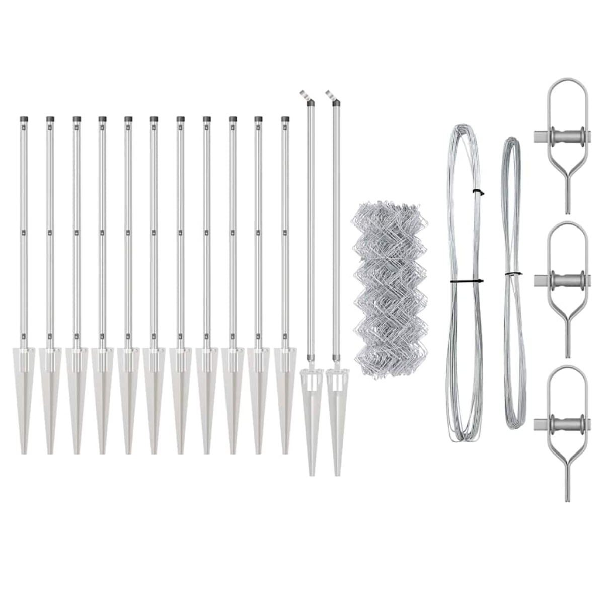 - 1 x Chain link fence, 11 x Post, 2 x Angle post, 11 x Spike, 2 x Angle spike, 11 x Plastic cap, 33 x Plastic tension wire supporter, 33 x Crew on the plastic supporter, 2 x Angle post cap, 2 x Angle post Hardware, 3 x Tensioner, 1 x 25m Binding wire, 1 x 80m Tension wire