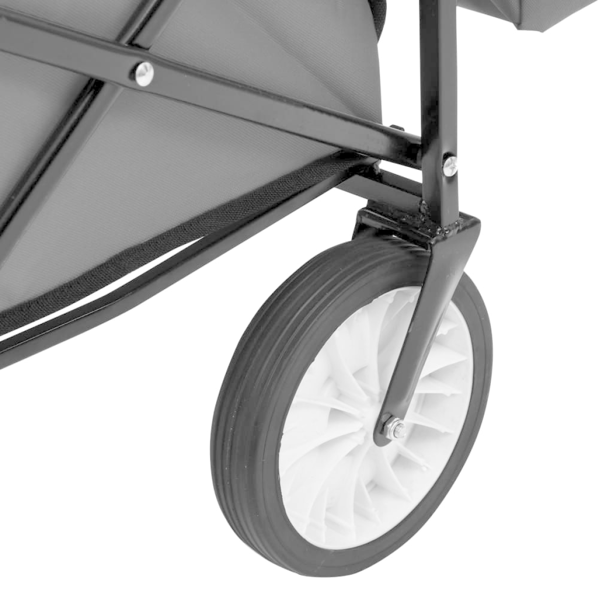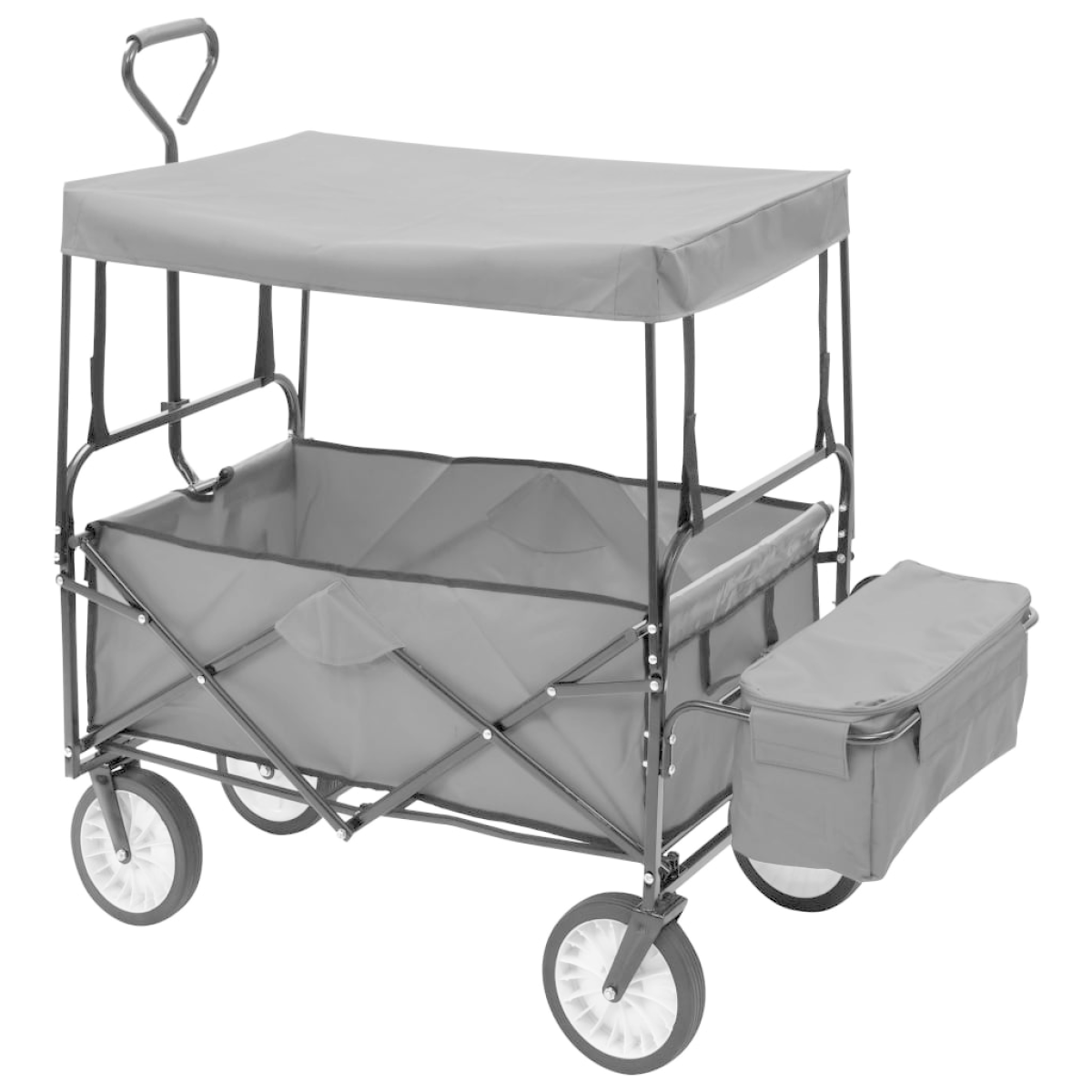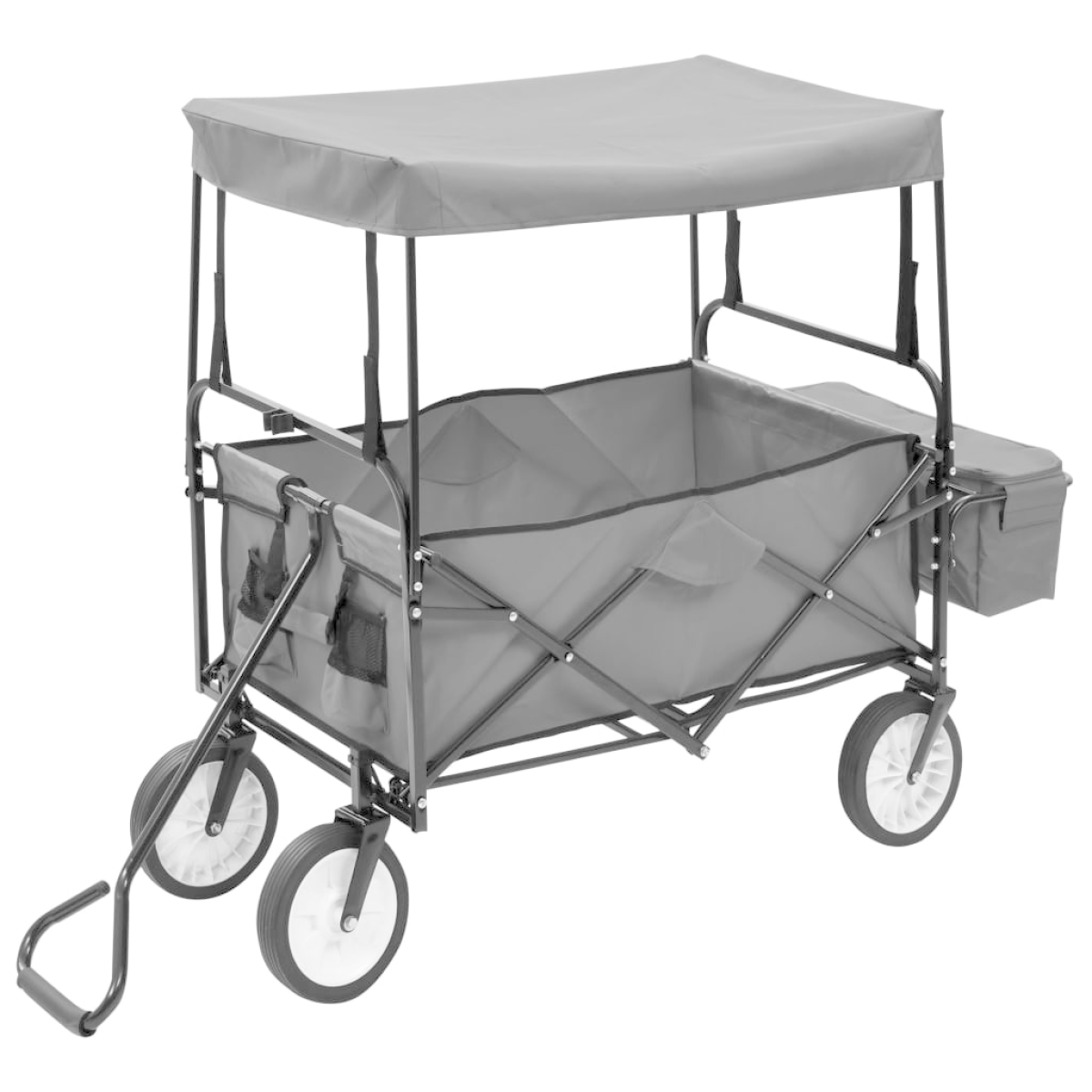 This folding hand trolley has a versatile use including being used at home, in the garden, for trip and more. The steel frame and 600D oxford fabric ensure that hand cart is sturdy, durable and easy to clean. With a loading capacity of 75 kg, the wagon can easily transport your belongings, cargoes, plants, fertiliser, tools and other stuffs. Additionally, the 360° rotatable front wheels enable the trolley move smoothly on uneven and coarse road. Padded handle ensures a firm grip as well. Thanks to its foldable design, the hand truck is easy to store and transport. The hand truck has a canopy which can protect your tools or other belongings from rain and sun exposure. Please note that it is not suitable for transporting children. The hand trolley is easy to assemble.