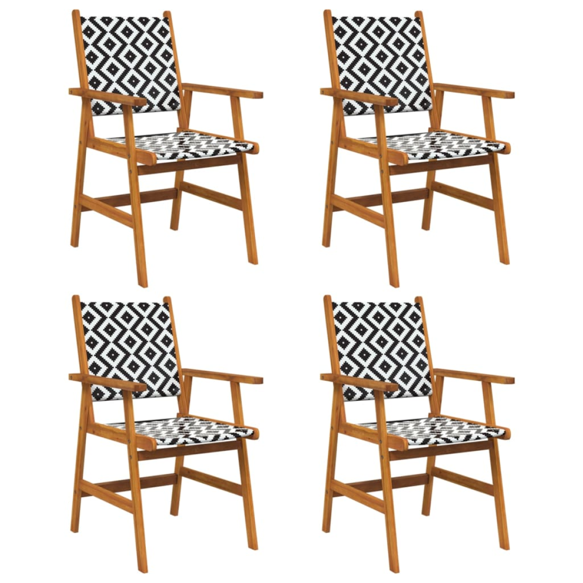 These wooden garden chairs provide a perfect place for you to relax and enjoy the sunshine in your garden or patio. With the poly rattan backrest and seating area, these outdoor chairs can provide ulmost seating comfort and easy to clean. The stable dining chairs feature a refined look that can instantly blend into any living space. Using these garden chairs to add a touch of fun and comfort to your garden or patio! Note: In order to extend the life of your outdoor furniture, we recommend you to clean it regularly and do not leave it outdoors without protection unnecessarily.Clean: Use a mild soap solution.Storing: If possible, store in a cool, dry place indoors. If the product is stored outdoors, protect it with a waterproof cover. Wipe and dry the excess water or snow from flat surfaces after a rain or snowfall. Allow sufficient air circulation to avoid moisture-related damage.