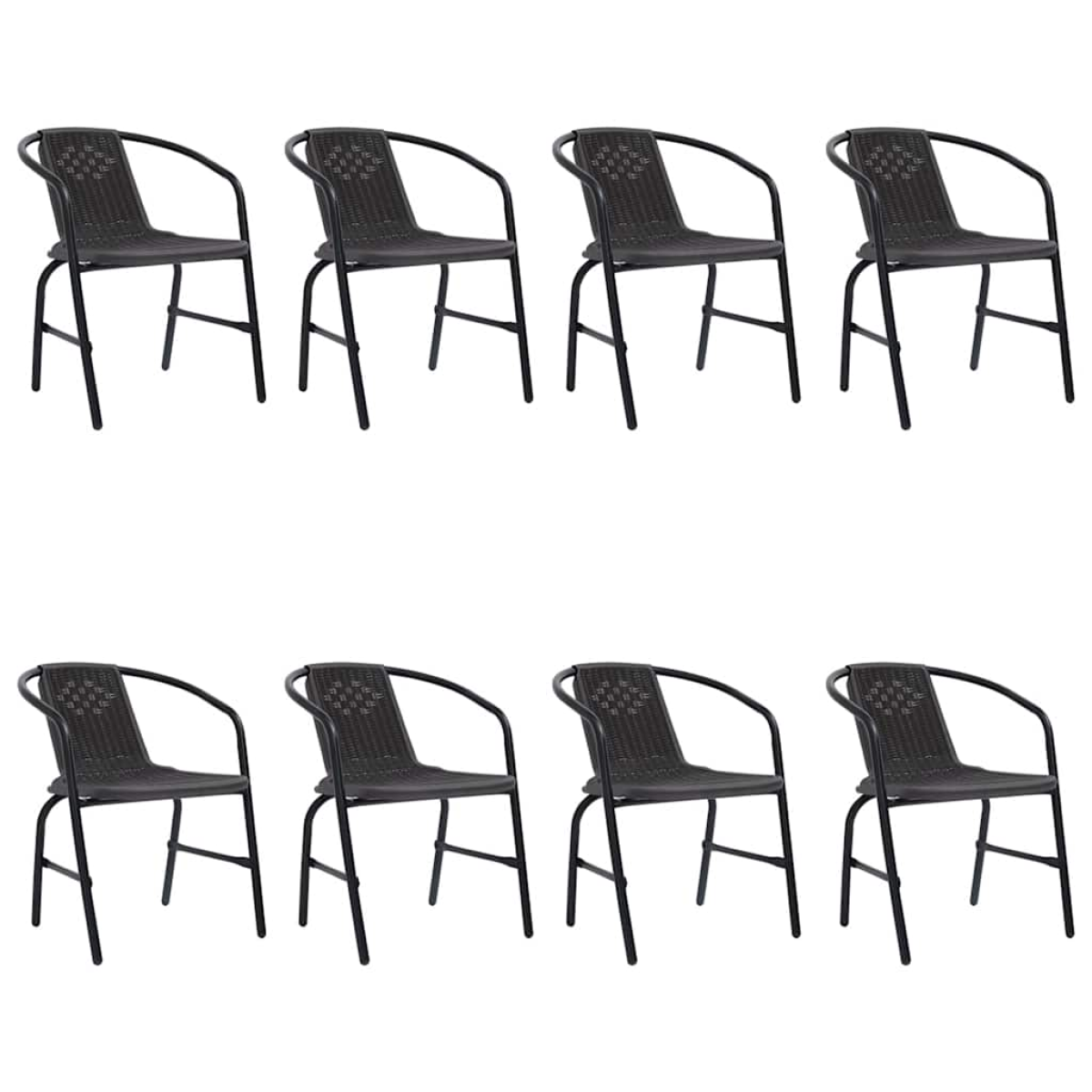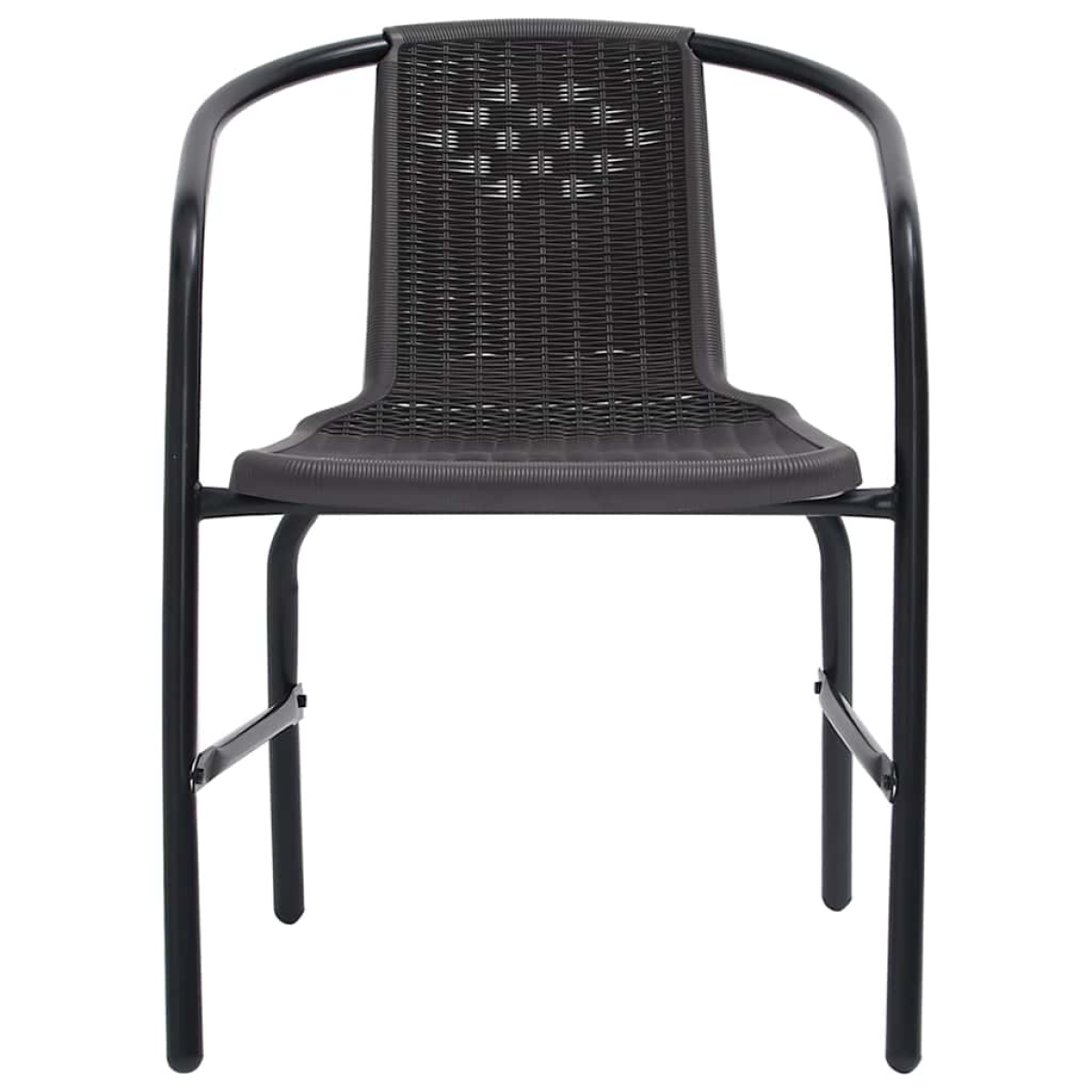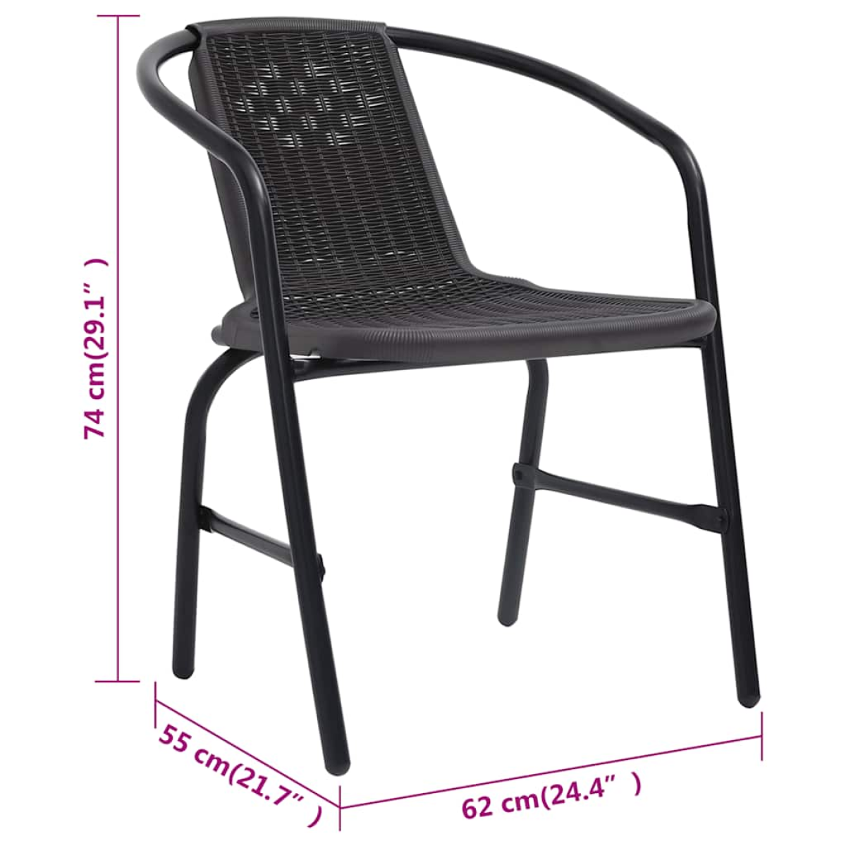 The garden chair set with rattan look is suitable for having your meals or just relaxing in the outdoors. Sturdy frame: Thanks to the steel frame, the outdoor chairs are stable and sturdy.Stackable chair: These armchairs are stackable to save space when not in use.Comfort seating: These patio chairs are made of plastic rattan, which add to seating comfort.Note:In order to extend the life of your outdoor furniture, we recommend you clean it regularly and do not leave it outdoors without protection unnecessarily.Clean: Use a mild soap solutionStoring: If possible, store in a cool, dry place indoors. If the product is stored outdoors, protect it with a waterproof cover. Wipe and dry the excess water or snow from flat surfaces after a rain or snowfall. Allow sufficient air circulation to avoid moisture-related damage.