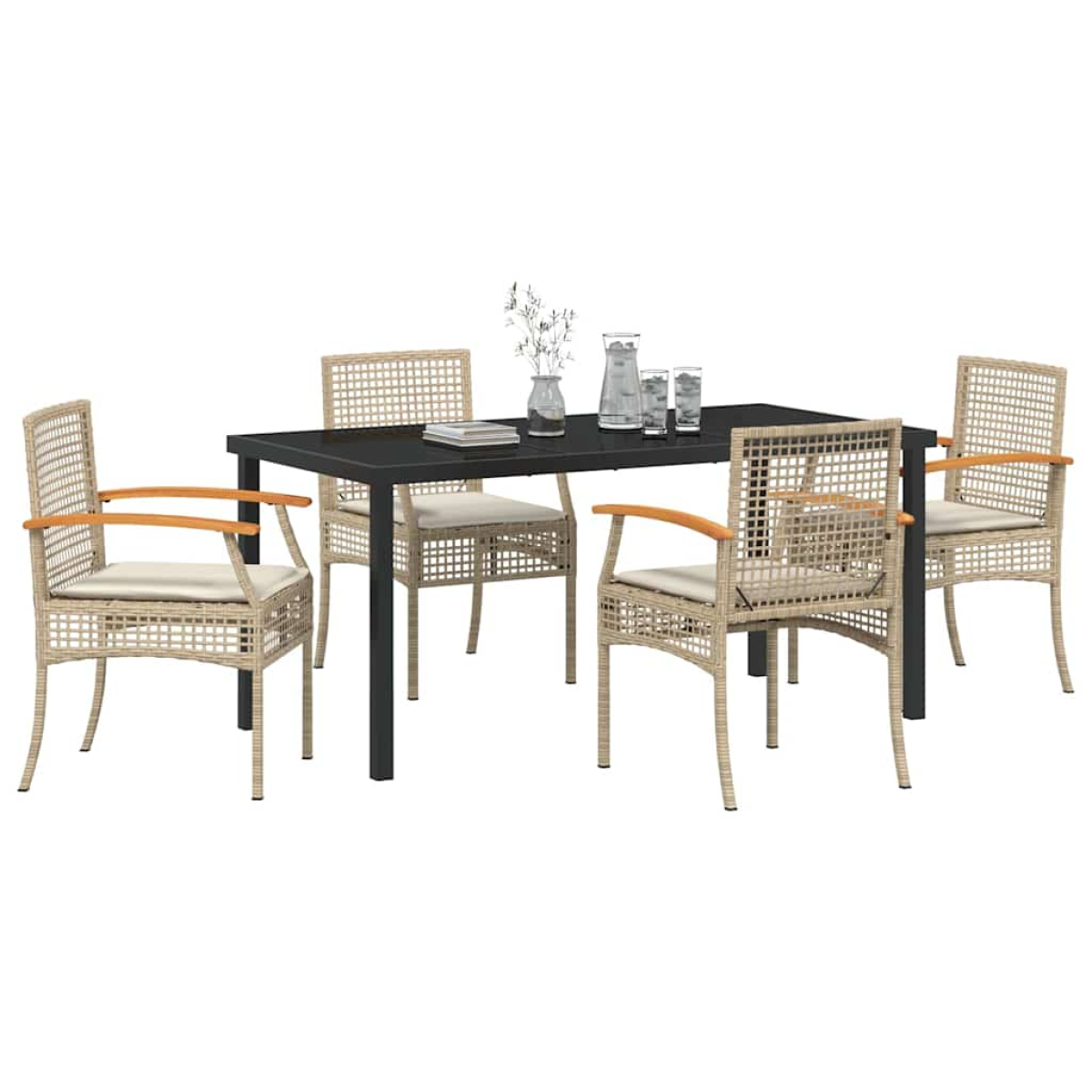 This Modern Garden Dining Set really shows off sophistication with its clean lines and multifunctional design, making it a great fit for modern outdoor spaces. It’s crafted just right for those summer get-togethers in the garden or on the terrace. This set mixes style with practicality, offering a warm welcome for outdoor dining and fun times. Its stylish looks and minimalist approach fit in beautifully with any style, whether you're throwing a party or enjoying a quiet dinner with family. Sturdy Materials: This fab mix of solid acacia wood means your dining set will last through all your summer parties. The natural wood grain adds a bit of elegance, and the poly rattan chairs are comfy and stylish. Plus, the black glass top brings a touch of sophistication to any meal or gathering. Complete Dining Experience: This set has everything you need for a great outdoor time. From comfy chairs made of poly rattan to the sleek glass-top table, each bit is carefully picked for maximum comfort and style. Functional Features: With strong steel legs and frames, each piece in this set promises stability and long life. The solid acacia wood armrests match perfectly with the comfy poly rattan backrests, balancing natural looks and durability for outdoor dining. Convenience and Care: Assembly is easy and only needs two people and a few tools. The care instructions give you the lowdown on protecting your outdoor furniture, suggesting a cover when it’s not in use to keep the weather at bay. Simple Maintenance: The main materials are a doddle to care for. A quick wipe-down keeps things looking sharp, so you're ready for every outdoor occasion.