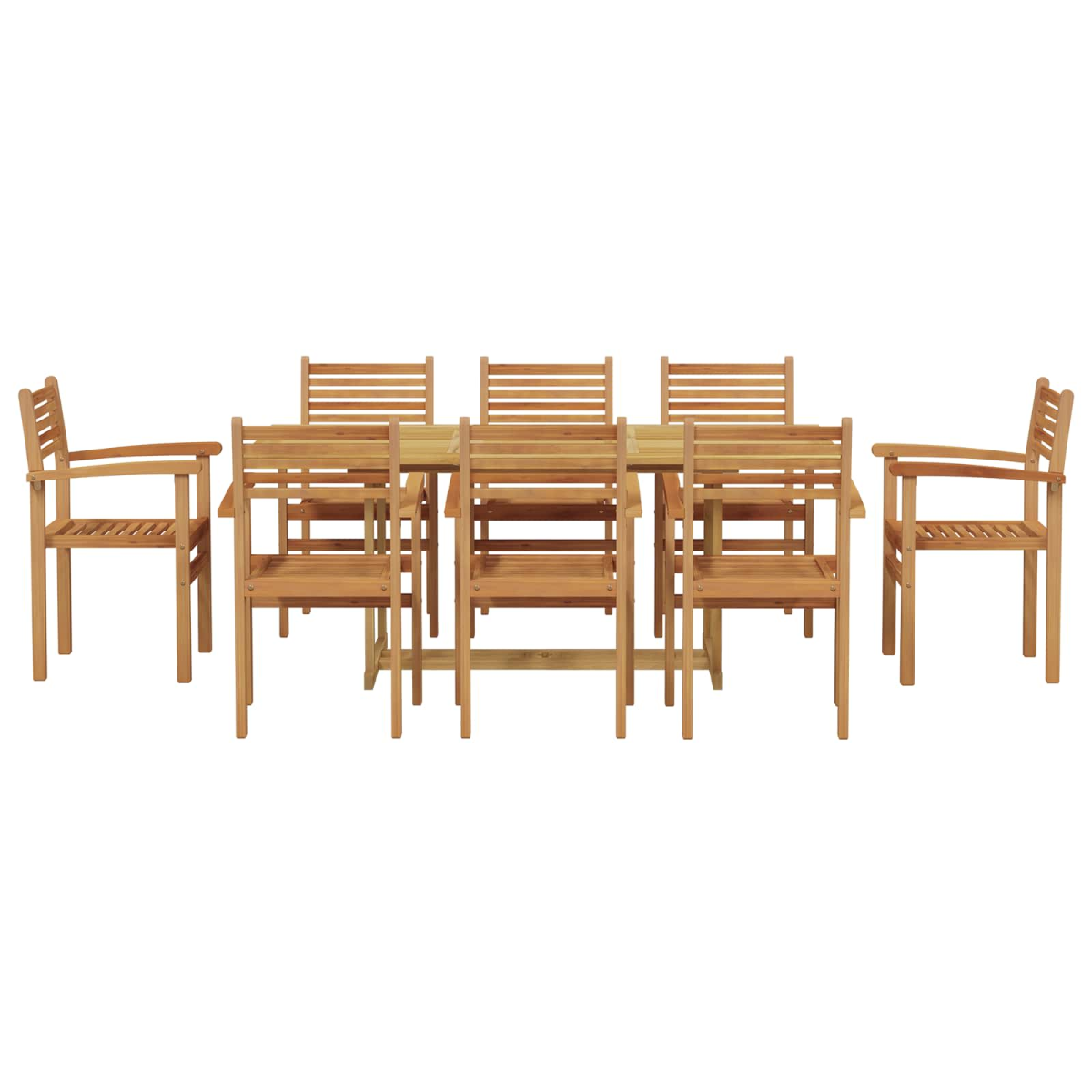 This Garden Dining Set made from solid teak wood blends contemporary style with lasting functionality, perfect for enhancing your outdoor space. Designed for both family gatherings and elegant soirées, it brings an inviting charm to any garden, offering ample seating in a sophisticated configuration. The sleek design complements modern décor, featuring clean lines and a warm, natural finish that enhances the green surroundings of your garden, terrace, or patio. Materials: Crafted from premium solid teak wood, this garden dining set embodies natural beauty and strength with its fine-grain finish and rich hue. Known for its robustness, teak maintains its integrity against weather elements, ensuring your outdoor area maintains its charm all year round. Included Components: This set includes a spacious table and comfortable chairs equipped with flat armrests. The square legs provide solid support, enhancing stability over various terrains such as grass or concrete, making it ideal for diverse outdoor settings. Features /Function /Design: Enjoy the long-lasting build of this set, designed to withstand the test of time. The durable construction supports everyday use, while the modern design meets both aesthetic and practical needs, ensuring the perfect blend of style and utility. Recommended Uses: Perfect for garden and terrace gatherings or simply enjoying a morning coffee outdoors. Its versatile design makes it suitable for regular family meals or special events, complementing various outdoor settings with seamless ease. Care &Maintenance: To preserve the furniture's beauty, cover the set when not in use, and follow care guidelines by avoiding harsh chemicals. Simple, straightforward maintenance safeguards its condition, ensuring long-term enjoyment.
