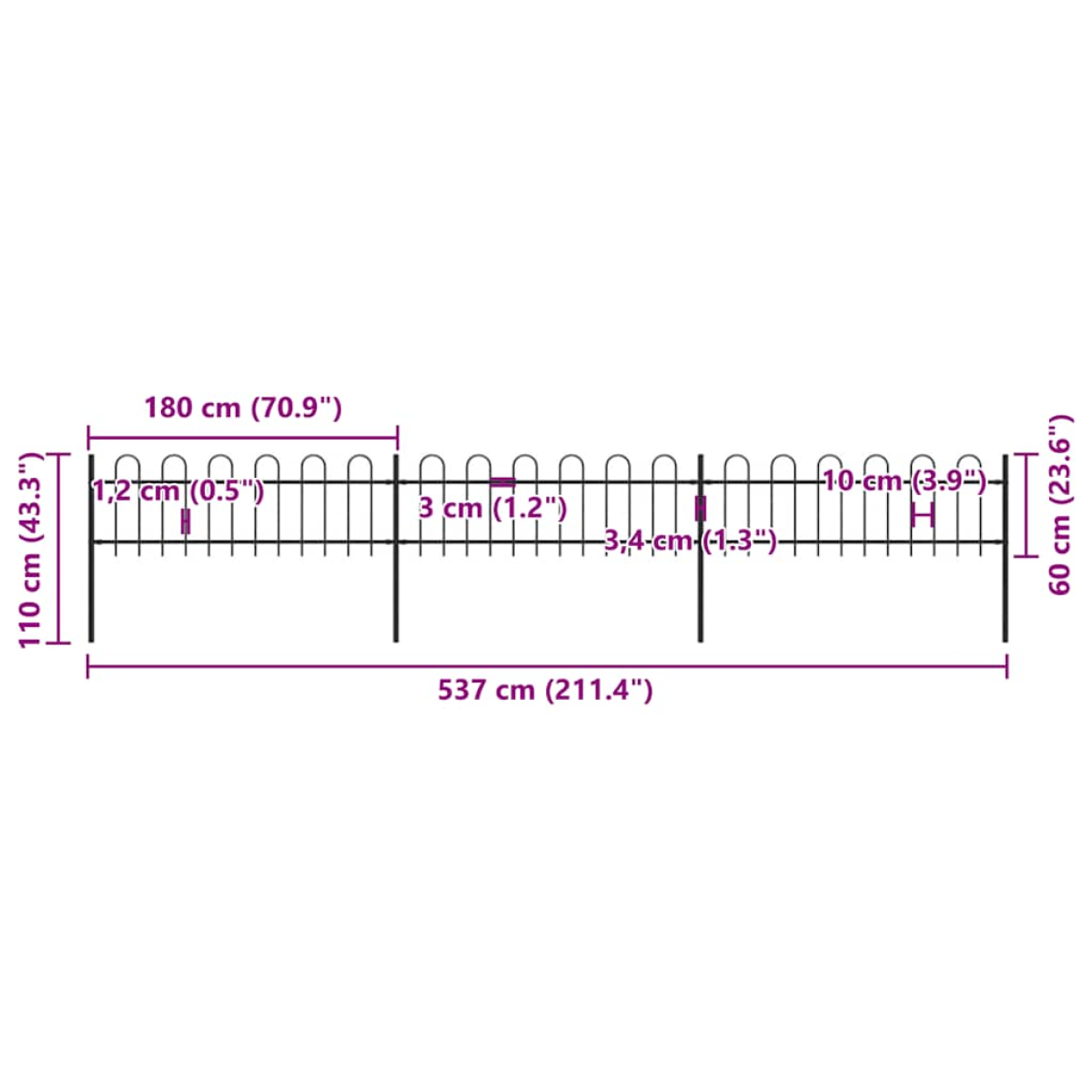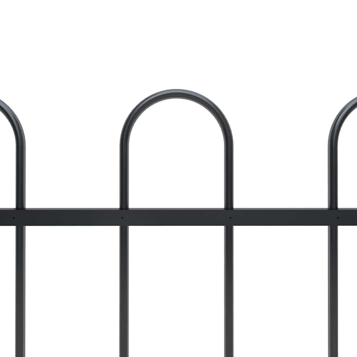 Create an elegant fence around your garden, home, or walkway with our garden fence! Our decorative steel garden fence, consisting of 3 fence panel and 4 posts, has a total length of 5.1 metres. It will form a sturdy, safe and maintenance-free perimeter barrier for your garden, home, or business property. With vertical bars with hoop top and strong horizontal brace as reinforcement to the frame, our garden fence will provide a high degree of security. Manufactured from heavy-duty, powder-coated steel, the outdoor fence is very strong and thus stable, sturdy and durable. Thanks to the included mounting materials, the garden fence is easy to assemble. Note: You can buy more sets to make the fence as long as you like.
