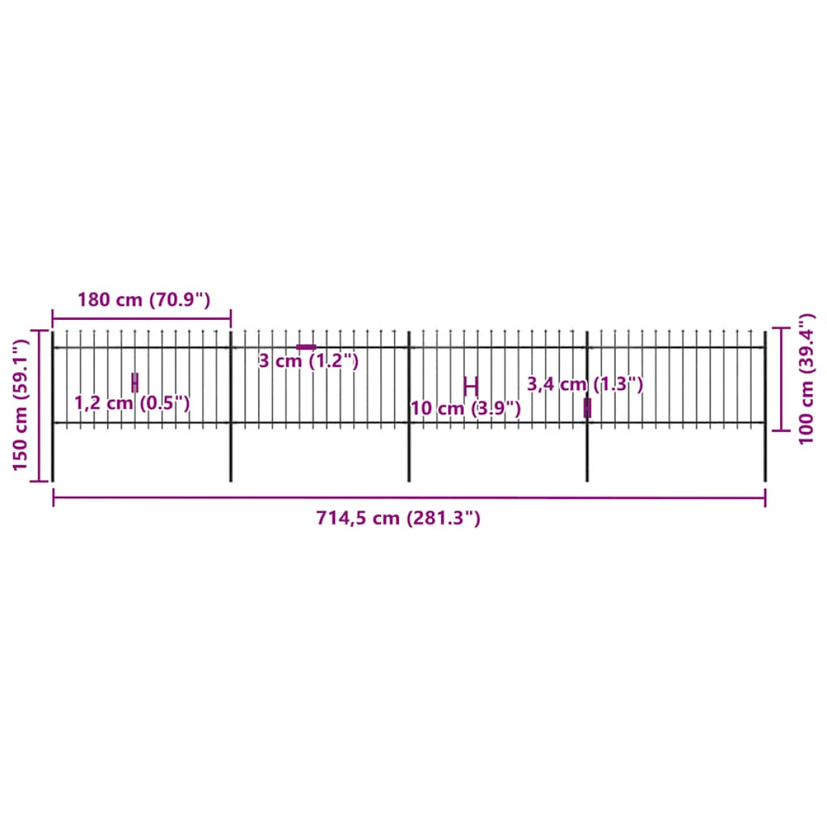 Create an elegant fence around your garden, home, or walkway with our garden fence! Our decorative steel garden fence, consisting of 4 fence panel and 5 posts, has a total length of 6.8 metres. It will form a sturdy, safe and maintenance-free perimeter barrier for your garden, home, or business property. With vertical bars topped with spear ends and strong horizontal brace as reinforcement to the frame, our garden fence will provide a high degree of security. Manufactured from heavy-duty, powder-coated steel, the outdoor fence is exceedingly stable, sturdy and durable. Thanks to the included mounting materials, the garden fence is easy to assemble. Note: You can buy more sets to make the fence as long as you like.